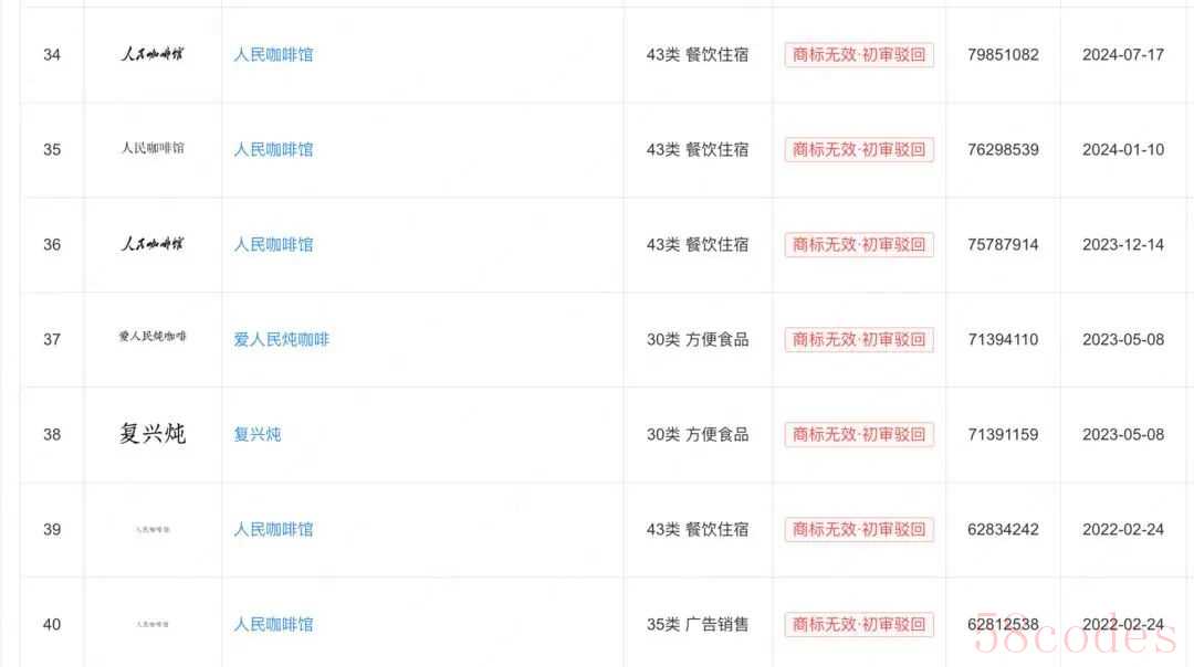 企查查数据显示,要潮文化的咖啡店名起初为“THE PEOPLE”,自2022年起先后多次申请“人民咖啡馆”商标,均被驳回,目前仅持有“潮人民咖啡馆”“要潮人民咖啡馆”两个注册商标。但记者查询其多家直营店门面图片发现,并没有“潮”和“要潮”的字样展示出来,各门店均为“人民咖啡馆”样式的招牌。