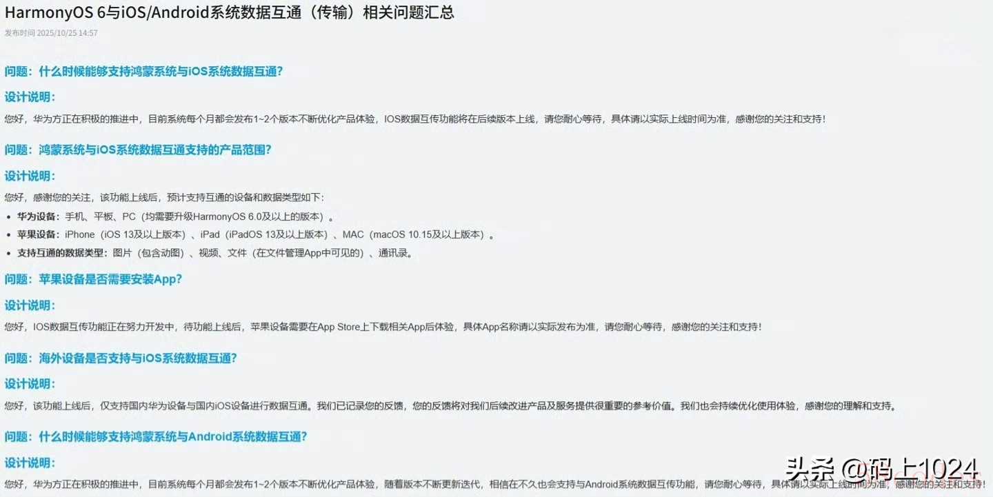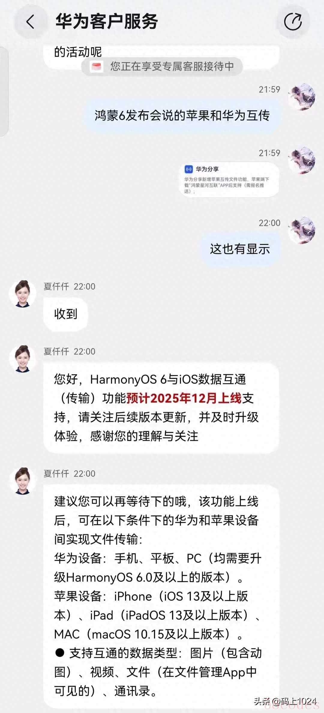 11月2日消息,华为在10月发布会上透露的鸿蒙HarmonyOS 6.0与苹果iOS文件互传功能,终于有了新进展。小编“码上1024”从华为客服处获悉,该功能预计12月正式上线,苹果用户需下载“鸿蒙星河互联”App实现跨平台传输。