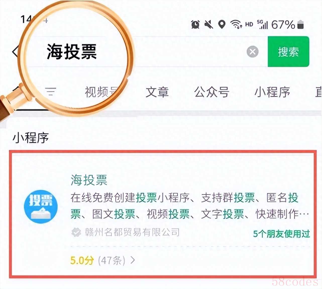 打开微信,点击“发现”>“小程序”,在搜索框中输入“海投票”,点击进入。