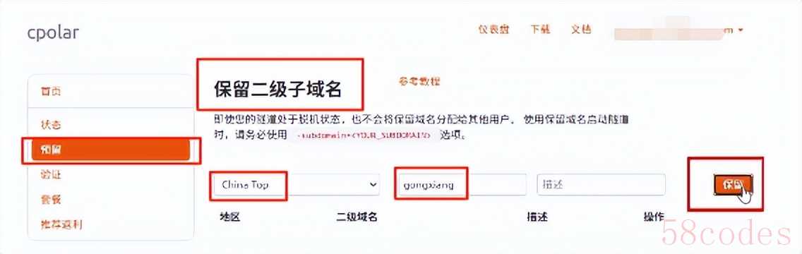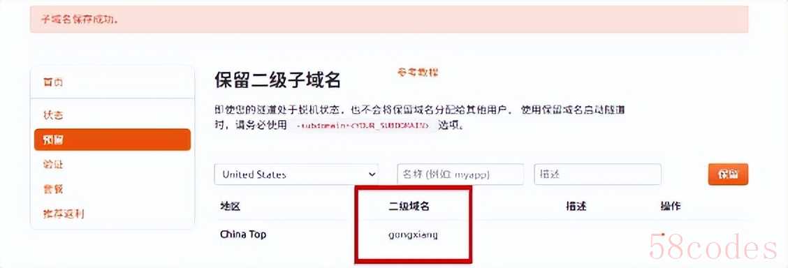 点击左侧的预留,选择保留二级子域名,地区选择china top,然后设置一个二级子域名名称,我这里演示使用的是gongxiang,大家可以自定义。填写备注信息,点击保留。