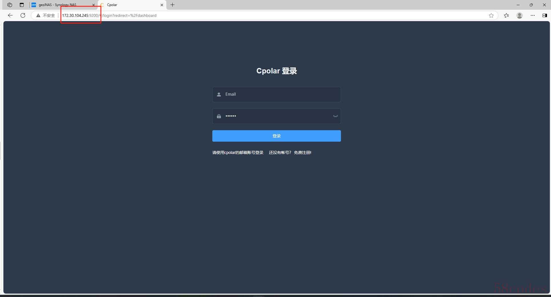 安装完成后,在外部浏览器,我们通过群晖的局域网ip地址加9200端口访问Cpolar的Web管理界面,然后输入Cpolar邮箱账号与密码进行登录,登录后,一切的操作在管理界面完成.