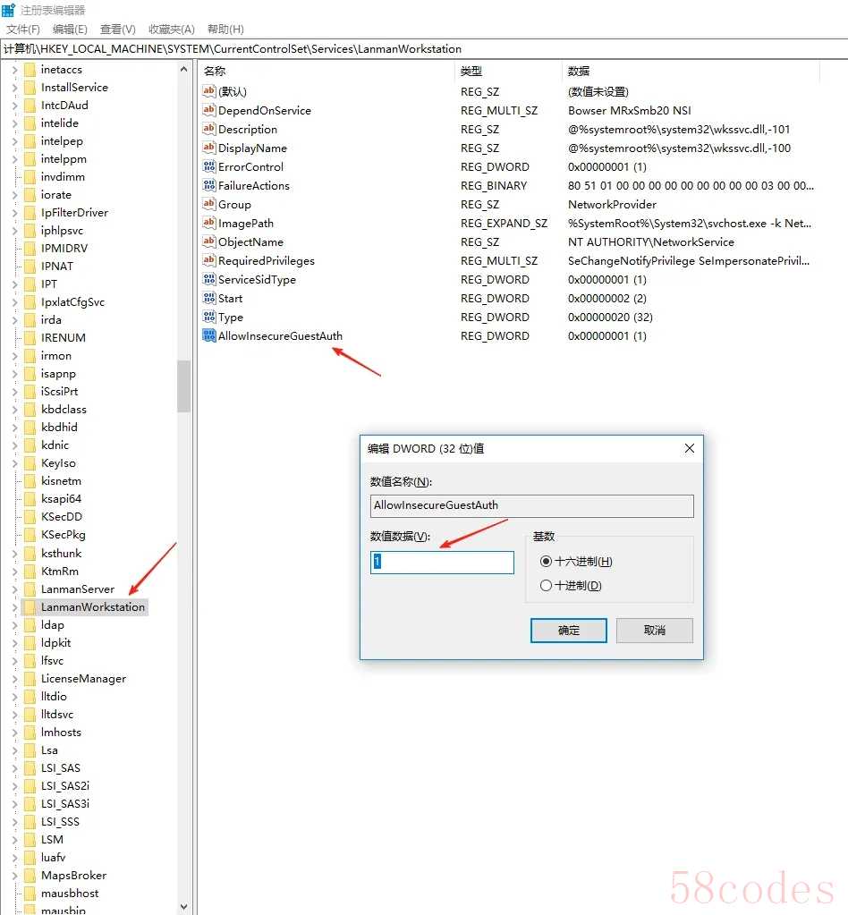 2、在注册表编辑器中依次展开HKEY_LOCAL_MACHINESYSTEMCurrentControlSetServicesLanmanWorkstationParameters,新建或修改DWORD值AllowInsecureGuestAuth,设置为1