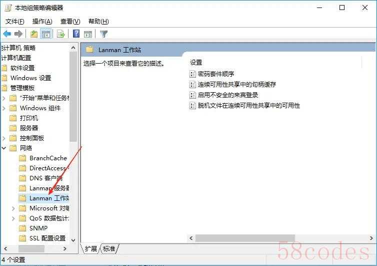 2、依次展开计算机配置→管理模板→网络→Lanman工作站。