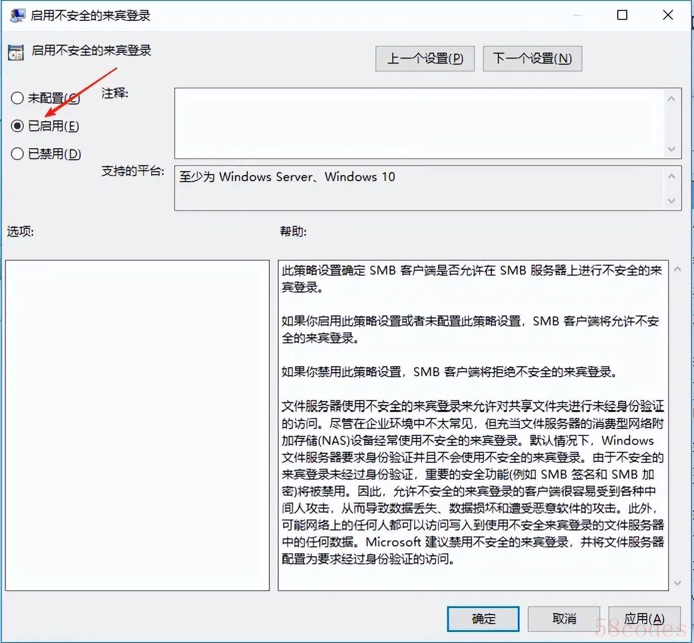 3、双击启用不安全的来宾登录,选择“已启用”后确认