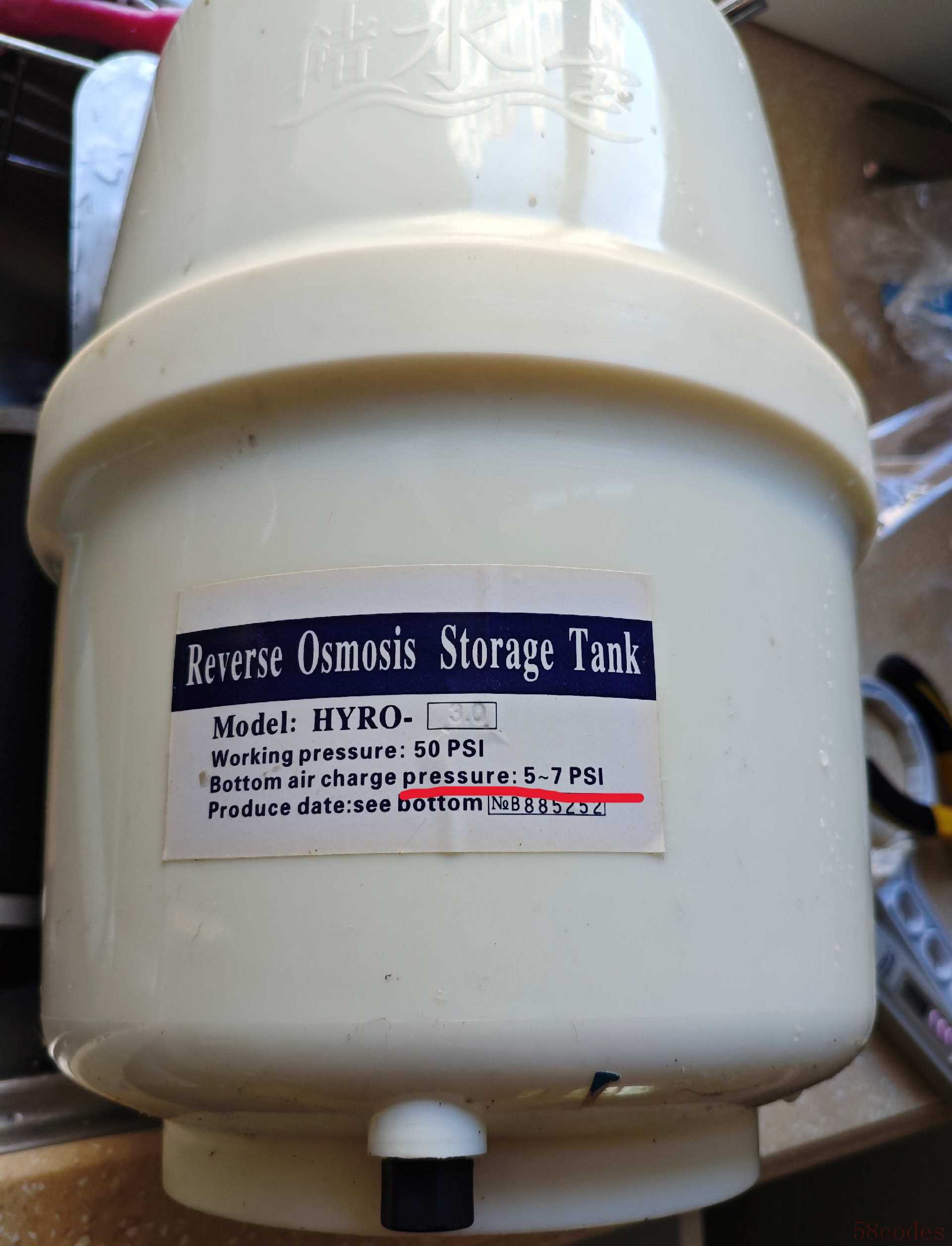 打气嘴保护帽,观察一下压力桶上的预充压力标识,图中压力桶标注空桶状态下充注压力是5-7psi