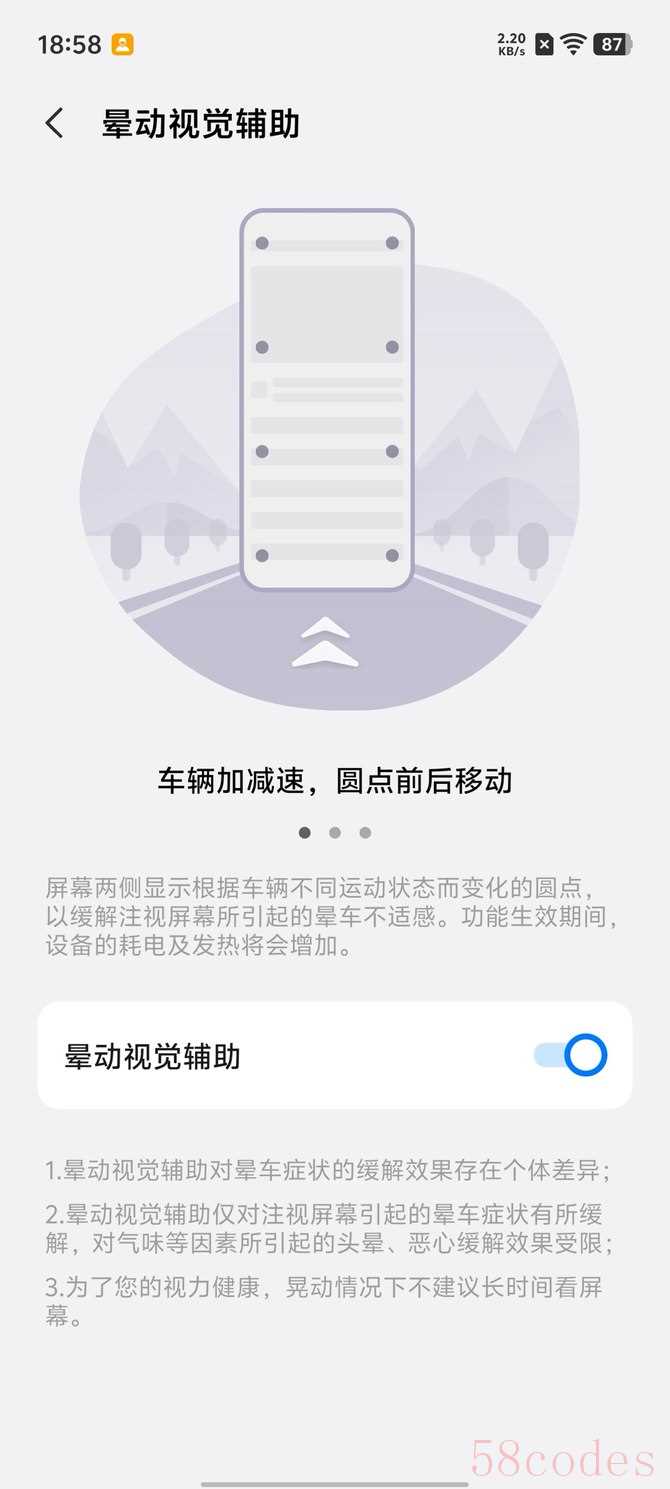 特别值得一提的是晕车视觉辅助功能,通过陀螺仪识别车辆运动方向和状态,屏幕两侧会显示跟随车辆运动的圆点,能有效缓解乘车时看手机的眩晕感,对于经常通勤的用户来说十分实用。不过该功能仅对注视屏幕引起的晕车有效,对气味等因素导致的不适缓解效果有限,且晃动时不建议长时间看屏幕。