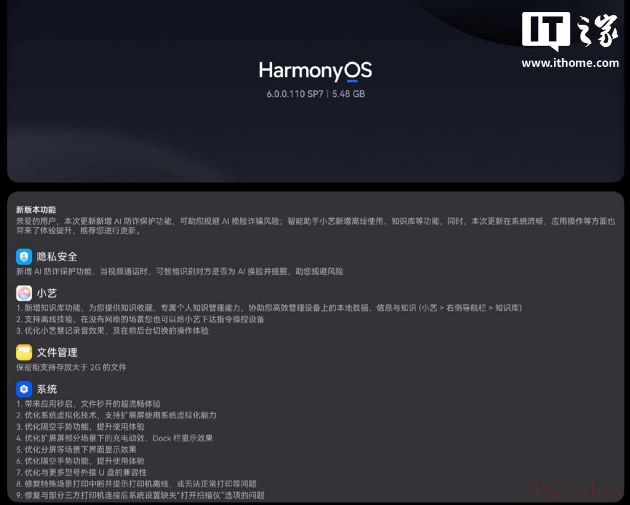 IT之家 11 月 6 日消息,华为 MateBook Pro 电脑现已推送鸿蒙 6.0.0.110 SP7 更新,主要提升多种场景的使用体验,新增 AI 防诈保护、小艺知识库等实用功能,大小 5.48GB。