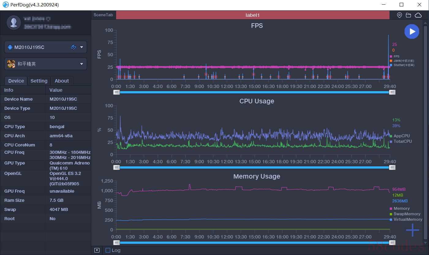 实测Redmi Note 9 4G的跑分超过18万分,稳定在中端水平。体验《和平精英》时,从PerfDog的检测结果可见,虽然它锁帧在25 FPS,但稳定性不错,操作也称得上流畅,“吃鸡”不成问题。日常使用它搭载的 MIUI12也相对顺滑。