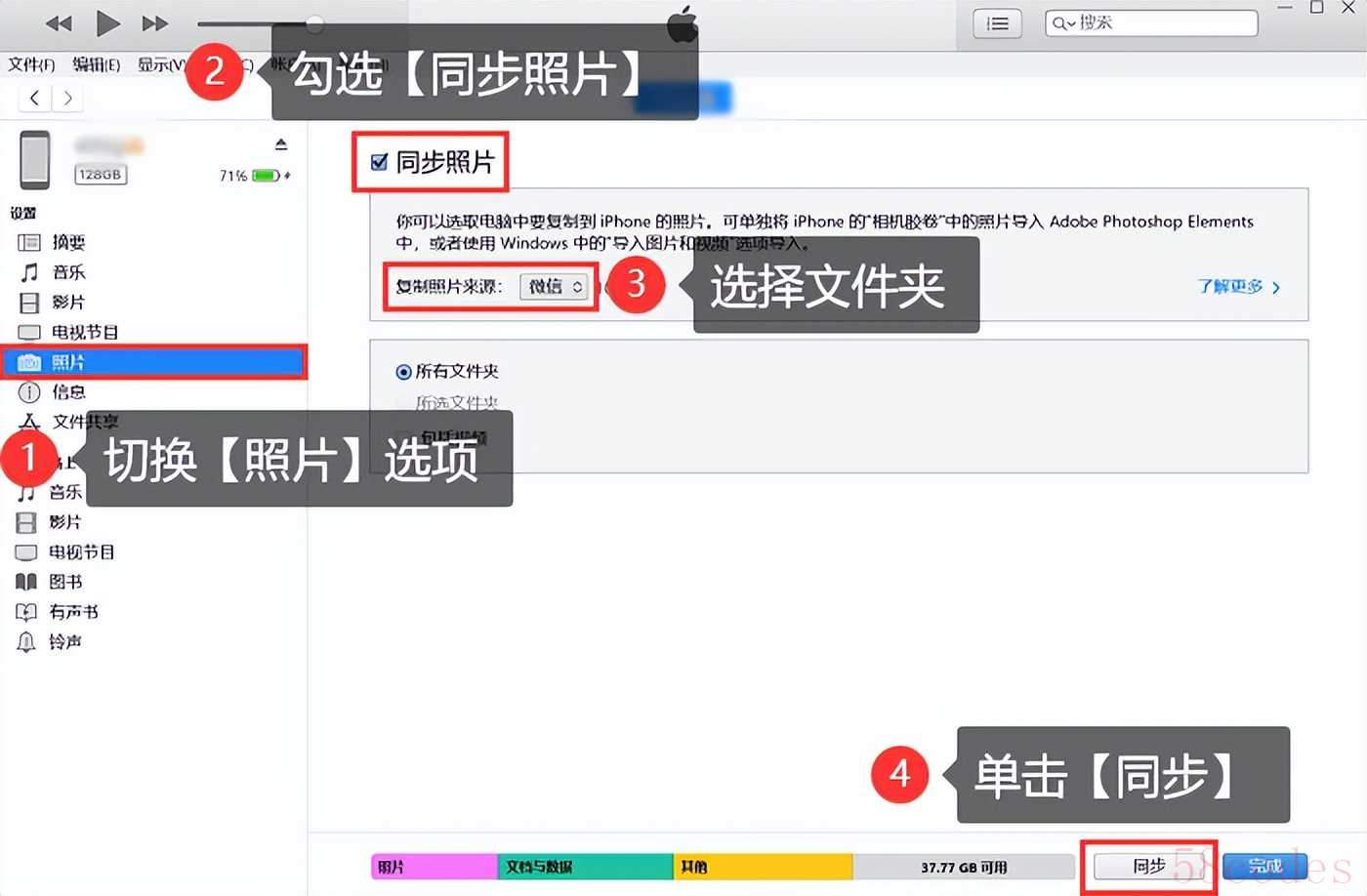 步骤4:在该页面中,先勾选【同步照片】选项,然后选择需要同步照片的文件夹,最后点击底部的【同步】按钮等待同步完成即可。