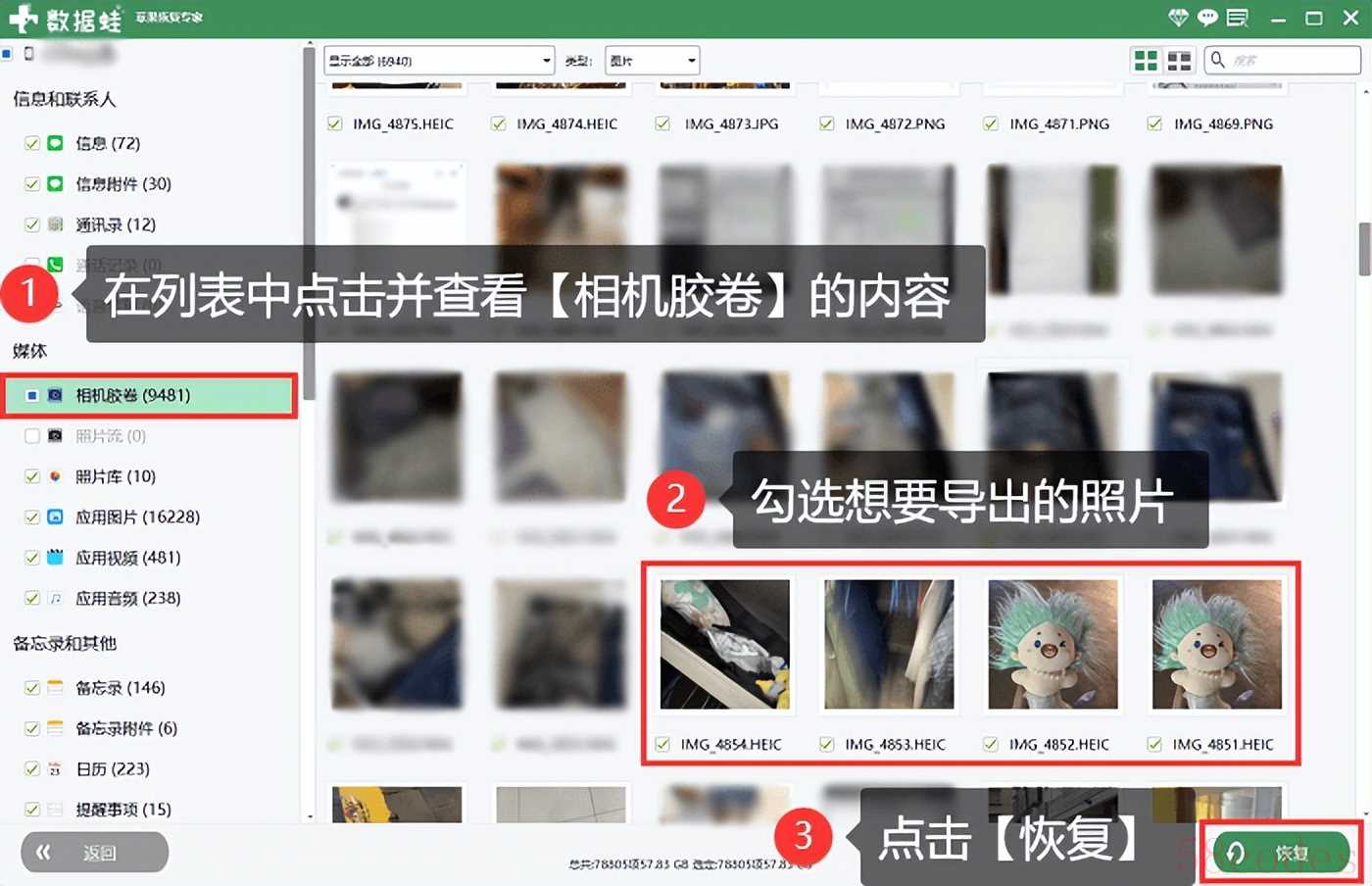 步骤3:当扫描完成后,软件会列出所有可恢复的数据。您可以预览【相机胶卷】中的内容,并选择需要导出的照片,然后单击【恢复】按钮。