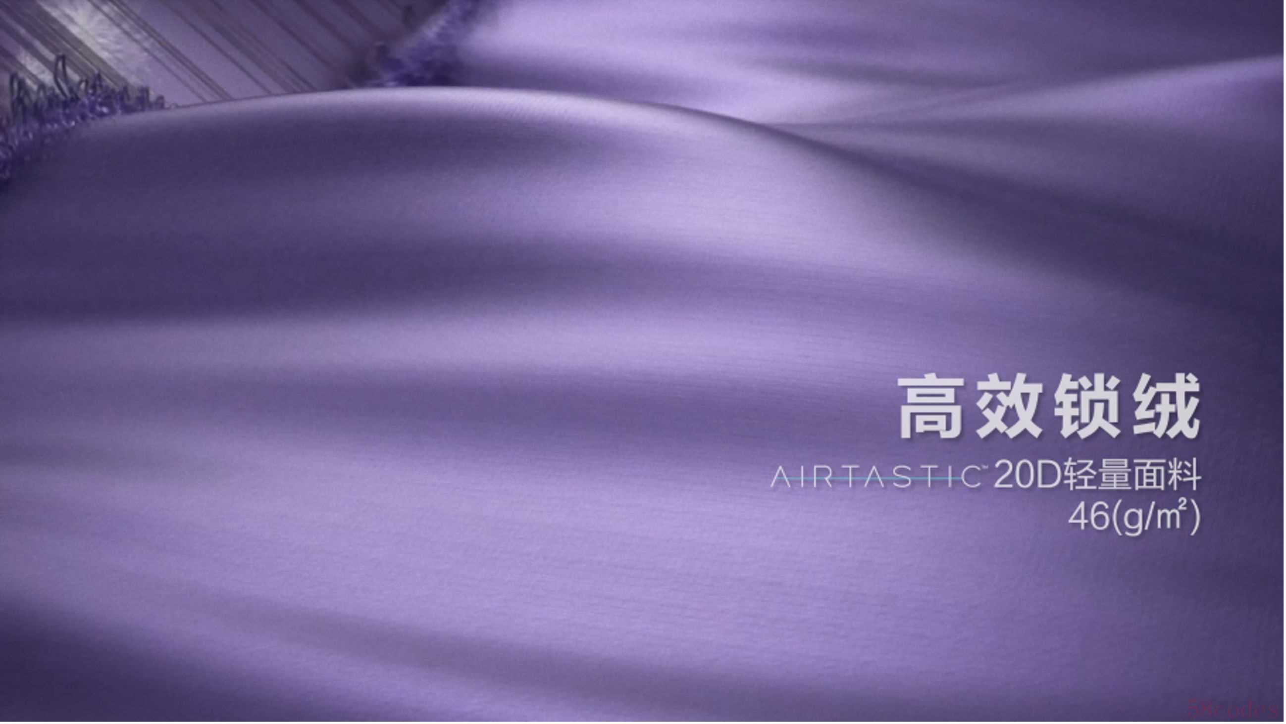 除此以外,FILA飞羽的轻盈,还来源于外层面料,选用日本东丽Airtastic 20D高密尼龙,每平方米仅46克,透湿率9500以上、透气率6mm/s,还可高效锁绒防钻绒 。