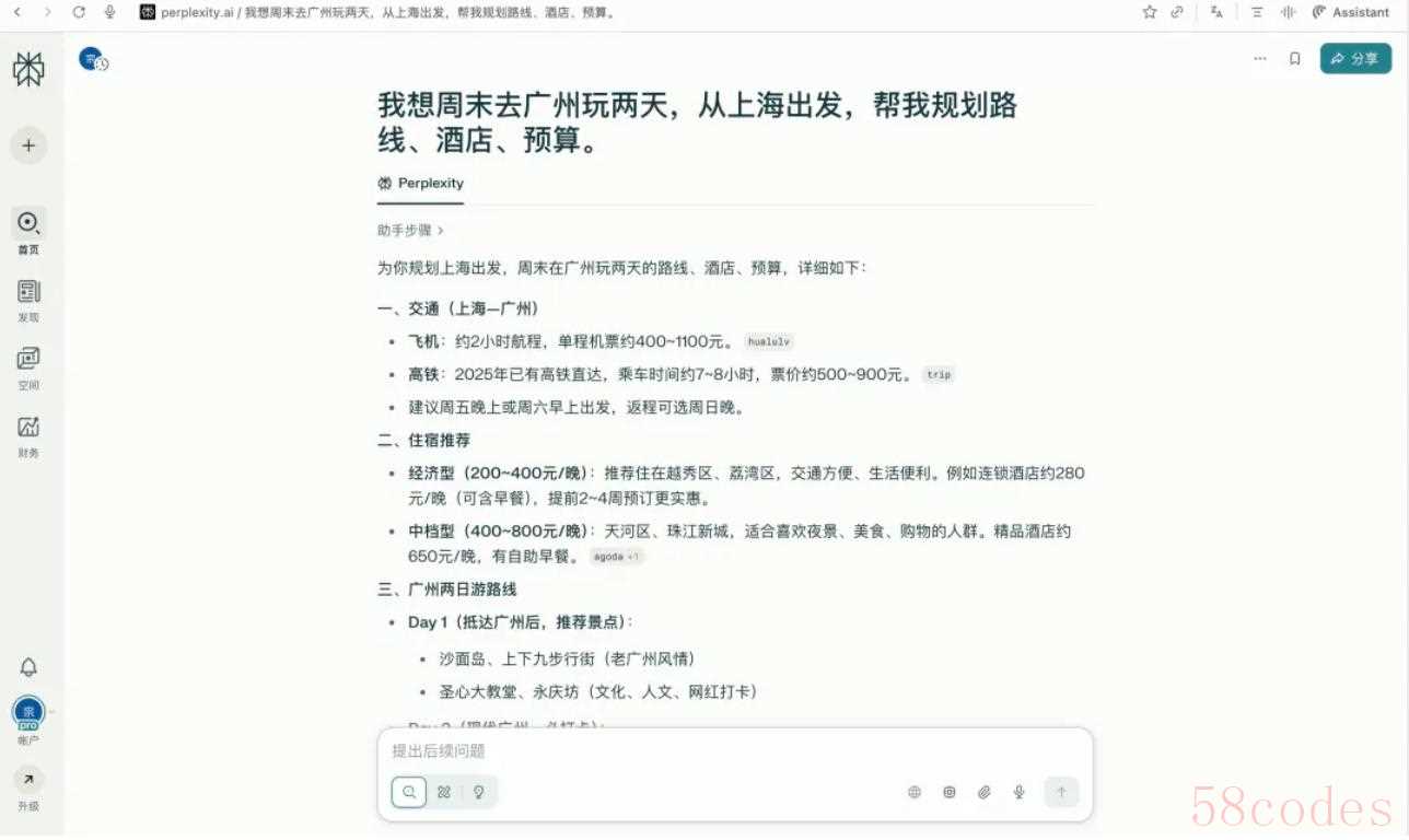 我们试了个需求:「我想周末从上海去广州玩两天,帮我安排路线、酒店和预算。」