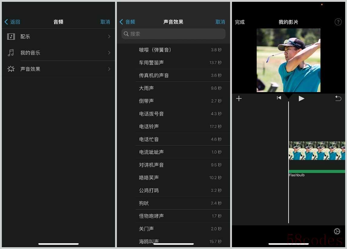 可以点击添加它自带的一些配音或者声音效果,也能添加自己保存的本地音频做配乐。