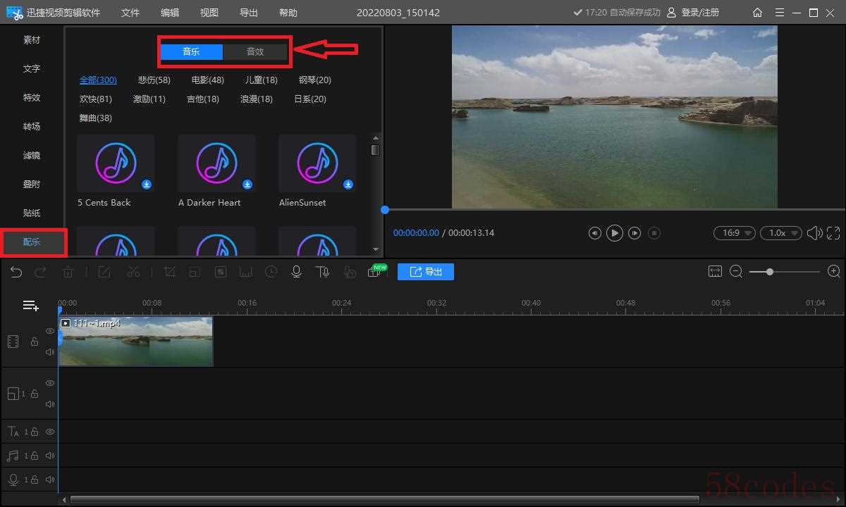接着我们选择【配乐】,里面有比较丰富的音乐素材,可以根据喜好选择拖动到时间轴上使用。 里面还有很多的有趣音效,可以给视频增加不少亮点。
