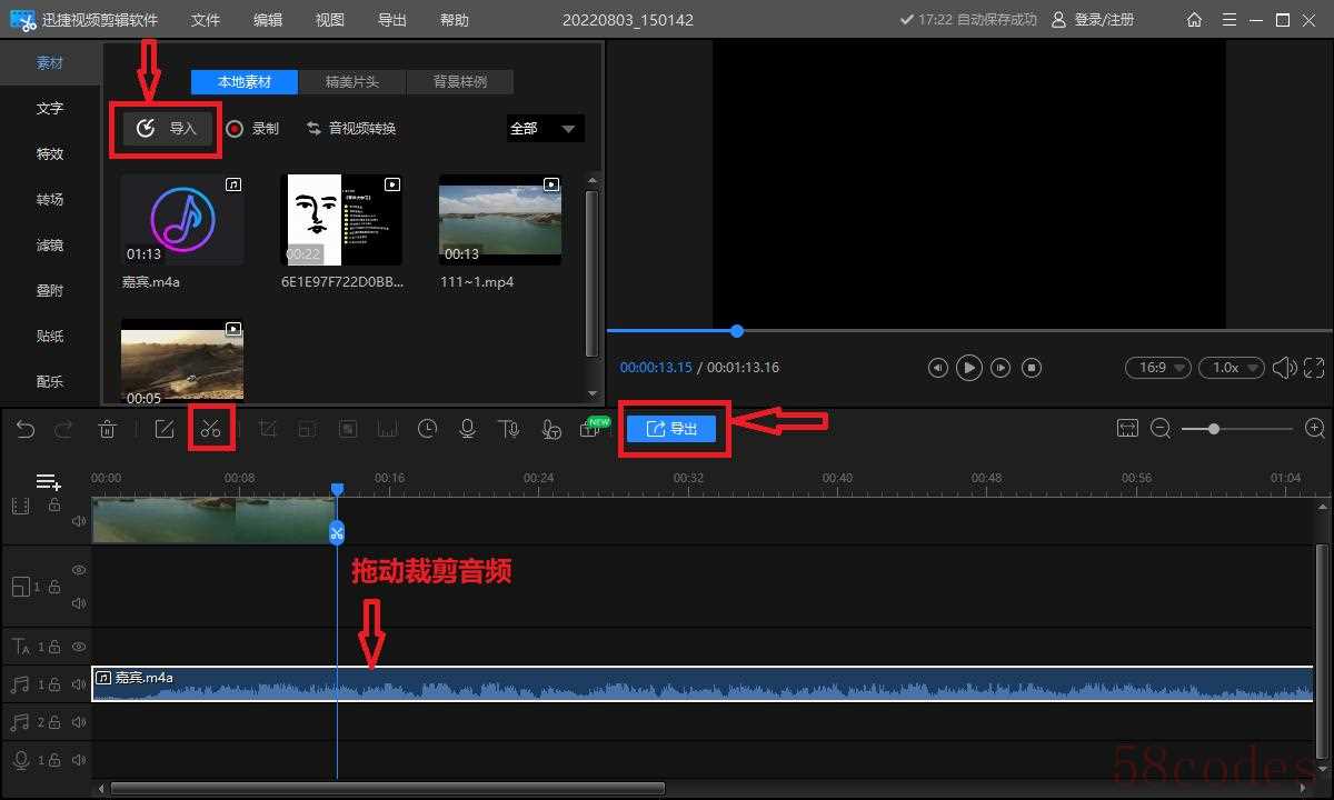 如果自己已经有了配乐素材,那么我们可以在【素材】中导入音频并拖动至时间轴使用哦。还可以拖动分割线裁剪音频文件的时长哦,配乐添加完成之后点击【导出视频】就可以啦。