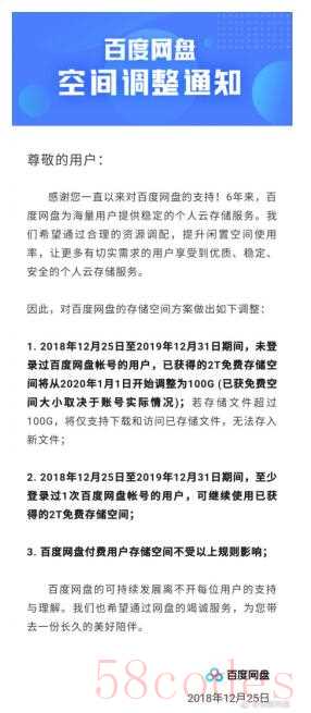 百度网盘发布的公告中表示:“1、2018年12月25日至2019年12月31日期间,未登录过百度网盘帐号的用户,已获得的2T免费存储空间将从2020年1月1日开始调整为100G (已获免费空间大小取决于帐号实际情况);若存储文件超过100G,将仅支持下载和访问已存储文件,无法存入新文件。2、2018年12月25日至2019年12月31日期间,至少登录过1次百度网盘帐号的用户,可继续使用已获得的2T免费存储空间。3、百度网盘付费用户存储空间不受以上规则影响。”