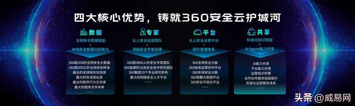 360安全云运营中心副总裁 张帆四大优势——通过对360集团全网安全数据及分析能力、顶级安全专家资源、探针管理体系、AI大模型及AI Agent等核心能力进行整合及共享,360安全云以360国家级安全能力赋能合作伙伴,省时省心省力地从0到1搭建起具备行业头部水准的联合运营中心,高效高质高能地向区域企事业单位输送安全运营服务。