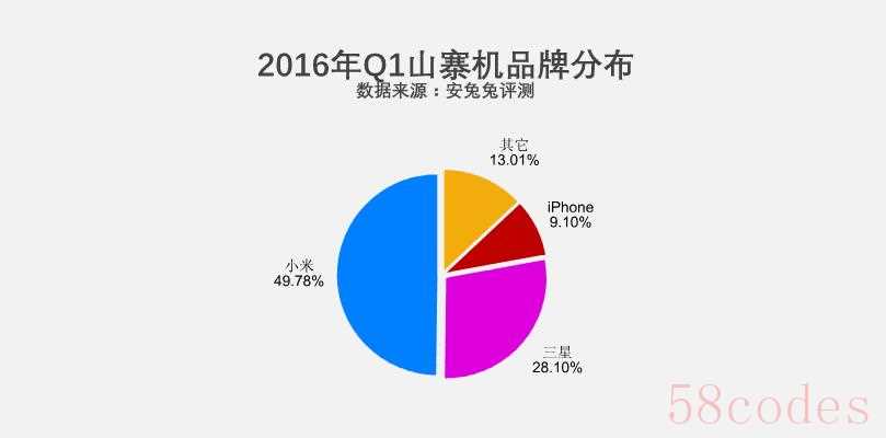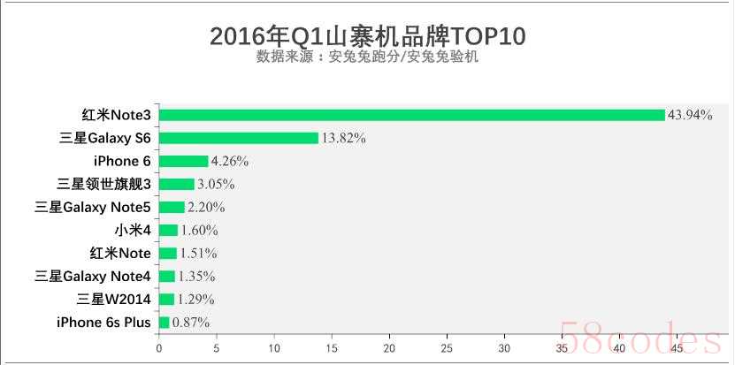不久之前,安兔兔发布了2016年Q1季度的山寨情况,采样时间是2016年1月1日至2016年3月14日,验机数量为1949653台,其中山寨机数量为78635,占了总比的4.31%。品牌占比情况,小米占比49.78%,三星占比28.1%,iPhone占比9.1%,其他总量加在一起占比13.01%。其中,红米Note3山寨的占比达到了43.94%,三星Galaxy S6是13.82%,iPhone 6占比4.26%。