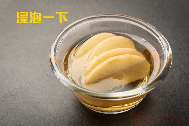 2. 倒入适量的白醋、米醋或柠檬汁,刚好没过苹果块即可。也可以挤上几滴柠檬汁。