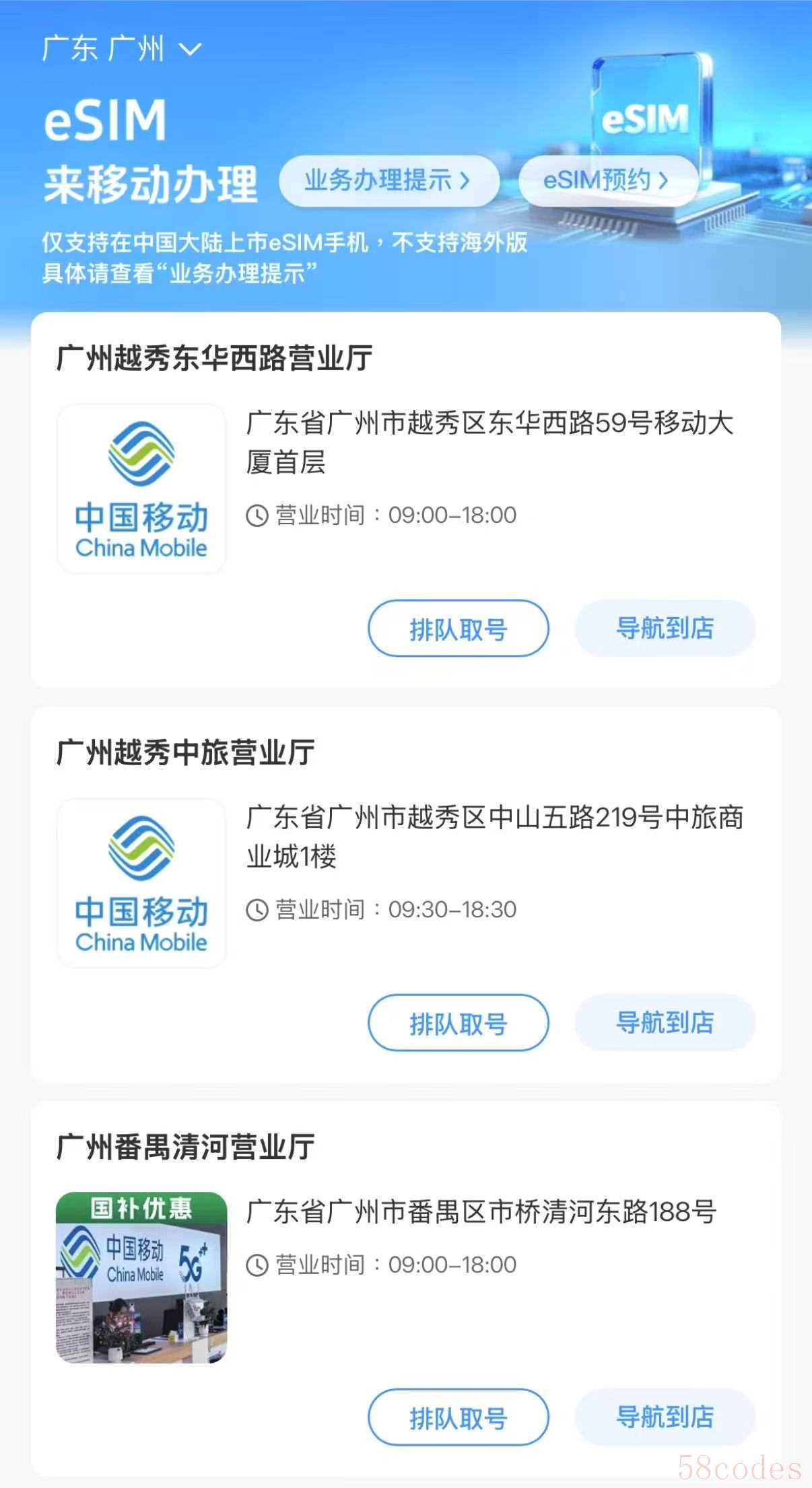 目前,移动、电信、联通都已经支持开通eSIM服务。以广州的移动为例,目前开通线下办理eSIM服务的营业厅并不少,只需在广东移动App上,搜索「eSIM」即可查看门店及地址。