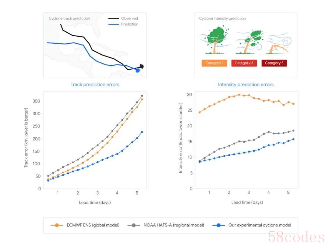 DeepMind公开的实验数据显示,在5天预测窗口内,该模型的路径误差与强度误差均显著低于主流系统(ECMWF、NOAA HAFS-A)。