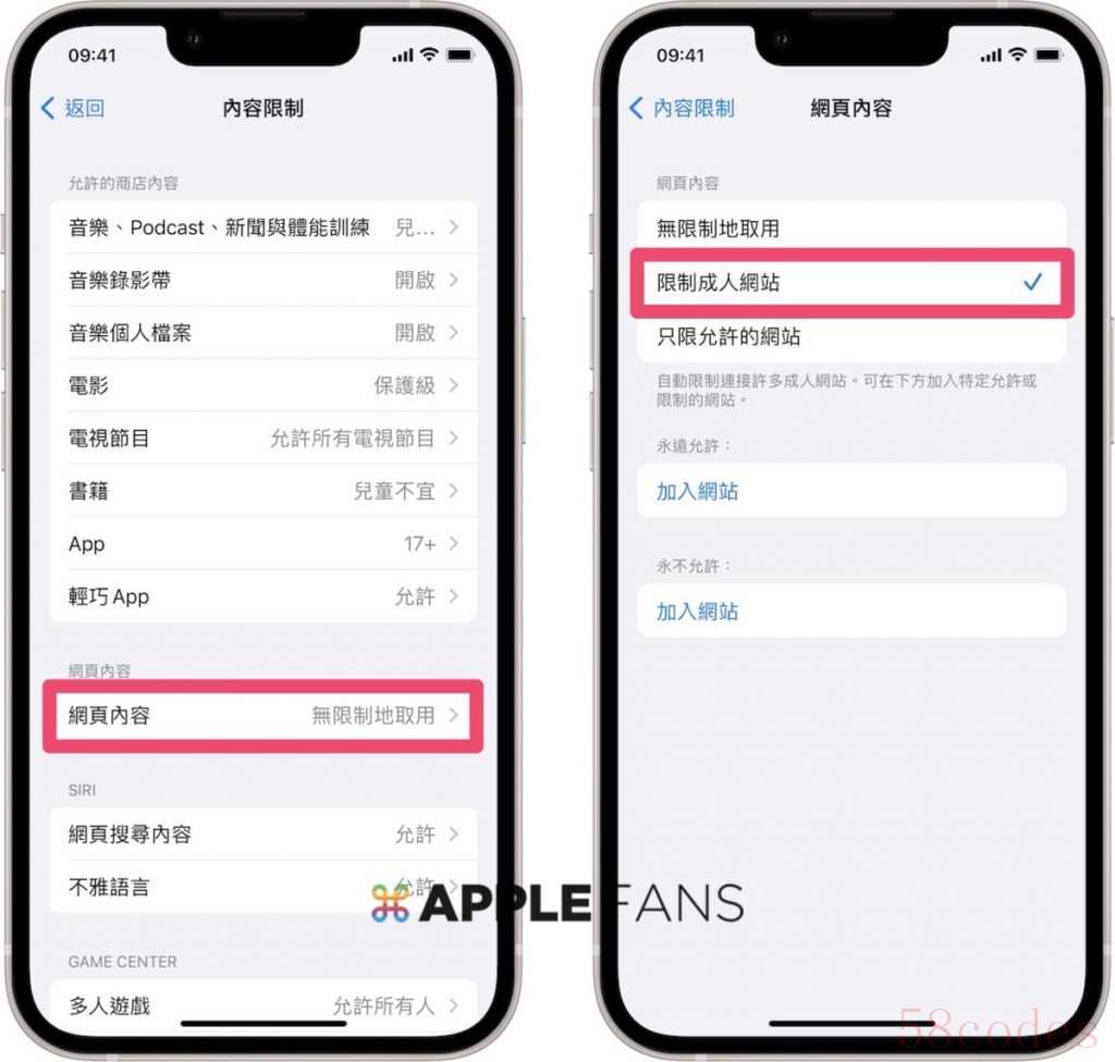 如果家里没有安装色情守门员,担心小孩会访问儿童不宜的网站内容,「内容与隐私权限制」>「内容限制」>「网页内容」设定成「限制成人网站」,不管小孩的i Phone 连线在哪个Wi-Fi 环境下,都会禁止访问任何的成人网站。