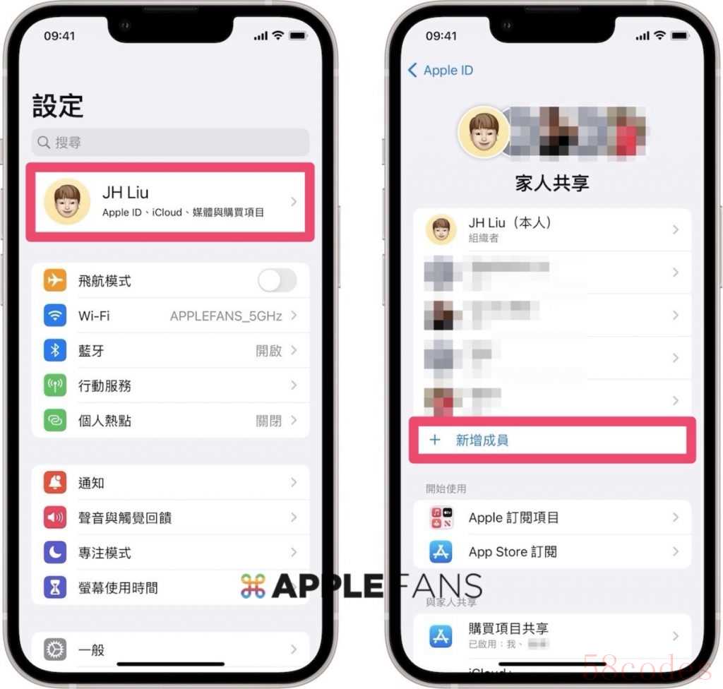 请先到「设定」app,点击「Apple ID 图像」里面的「家人共享」>「新增成员」。