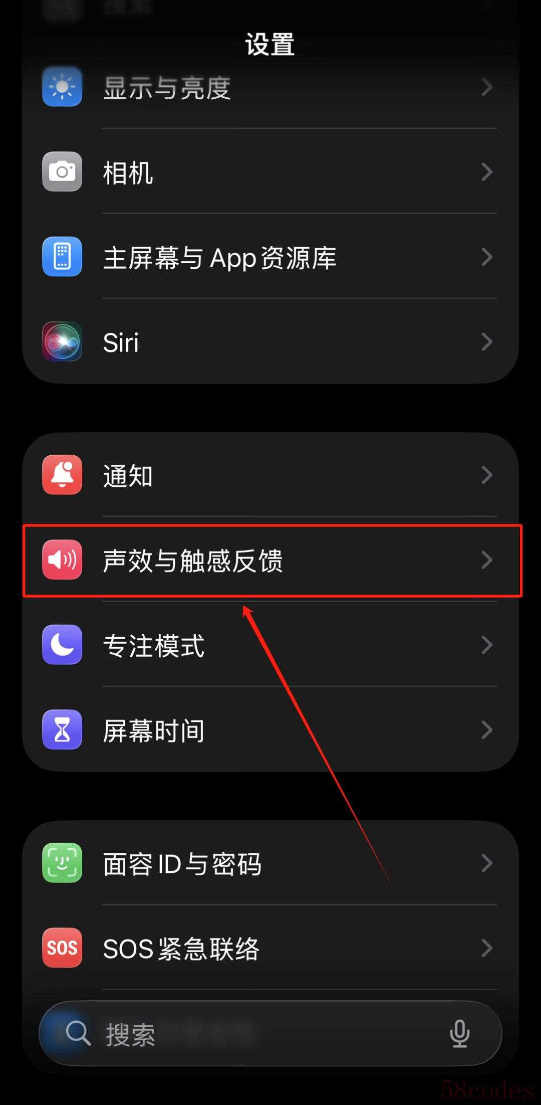 2. 向下滚动,找到并点击 "“声音与触感” (Sounds & Haptics)"。