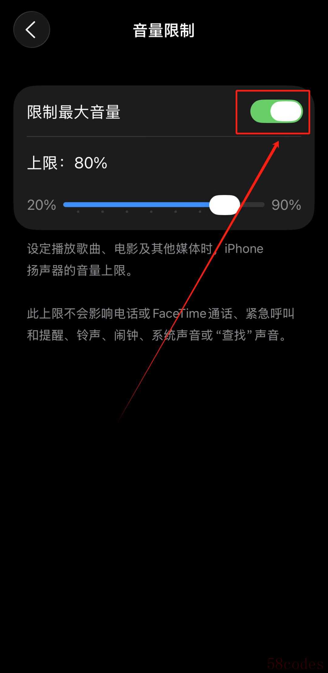 打开“限制最大音量”选项后的滑动开关,同时我们可以调整上限的比例。