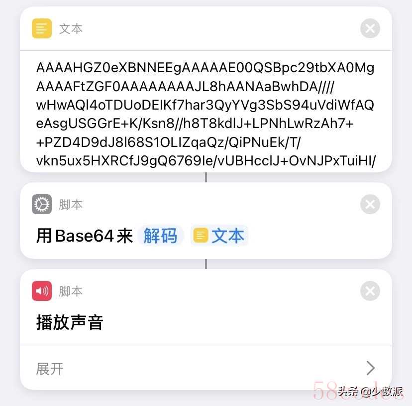 嵌入的原理则是利用 Base64 编码,将音频转化为文字并存储在自动化里。每次播放时,系统只需要在本地进行解码,不会因为文件被删而需要重新下载,也不需要依赖网络。