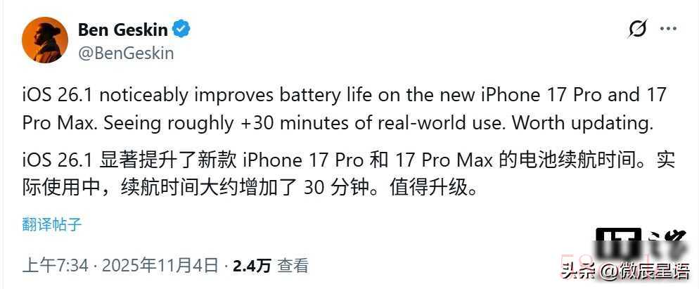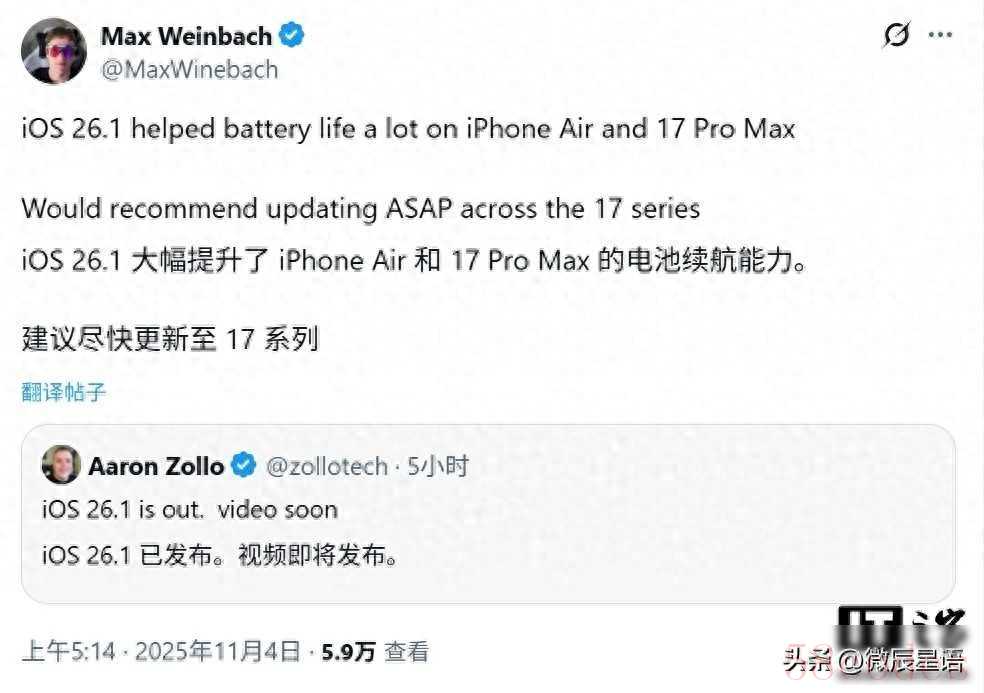 昨天很多人提到,iOS 26.1更新让手机续航时间增加了,像Max Weinbach和BenGeskin这些博主都测试过,说能多用大约半个小时,还建议用户尽快升级,iPhone 17系列包括Pro和Pro Max机型都有这情况,还有个“iPhone Air”的名字被提起,但官方没确认,可能是内部代号或者有人搞错了。