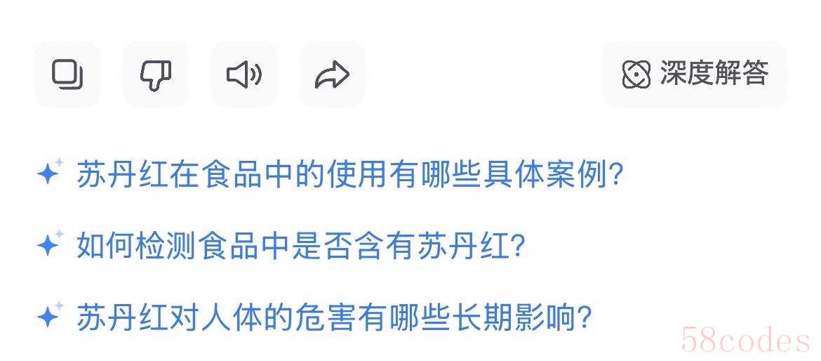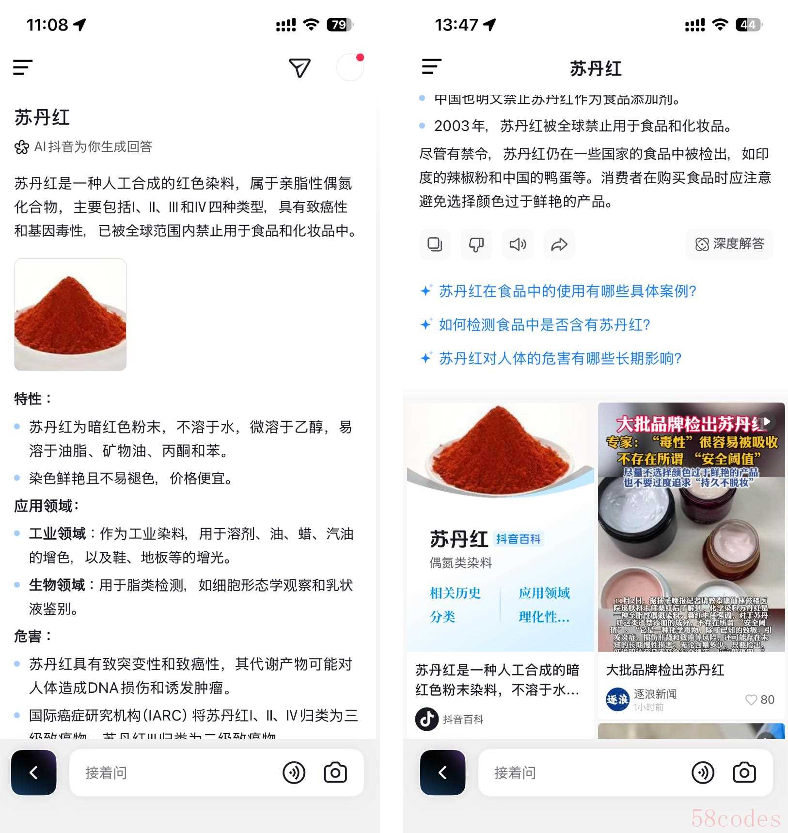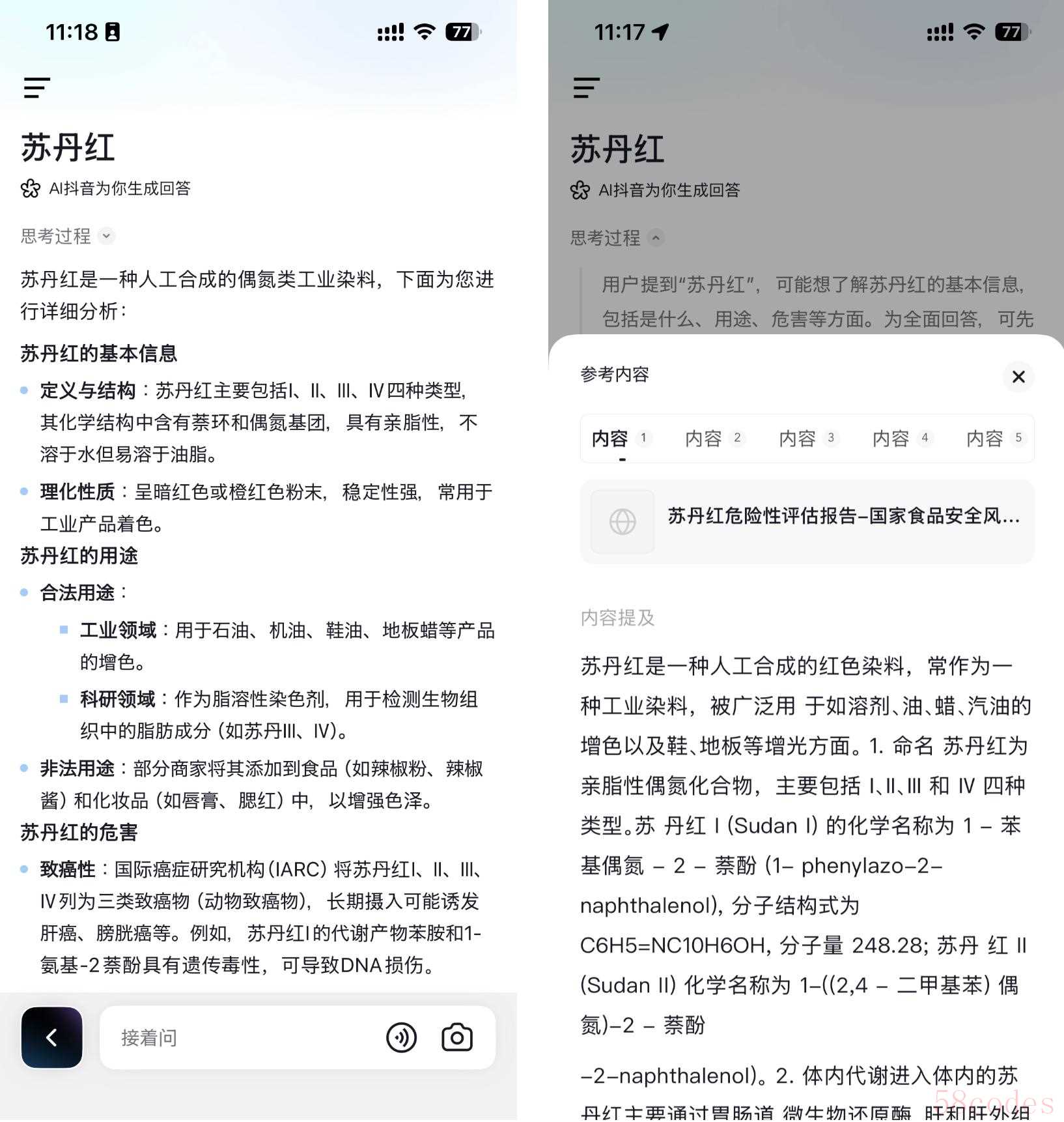 像是最近一些化妆品里检测出苏丹红,我们直接输入「苏丹红」,AI 抖音的做法是先给我们一段文字总结,像在用百度、或者 ChatGPT 之类的产品。