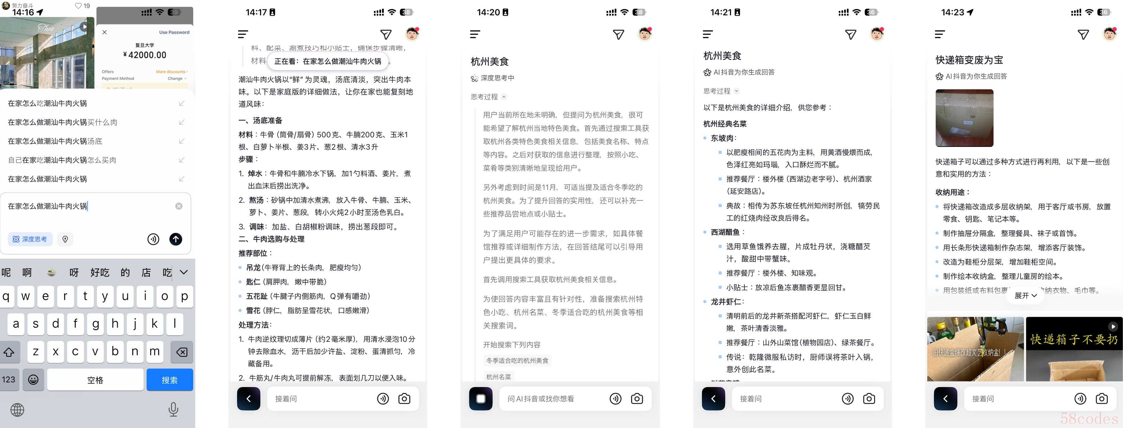 我们还问了它一些,平时用抖音可能会搜索的话题,像是吃喝玩乐、知识科普等等。