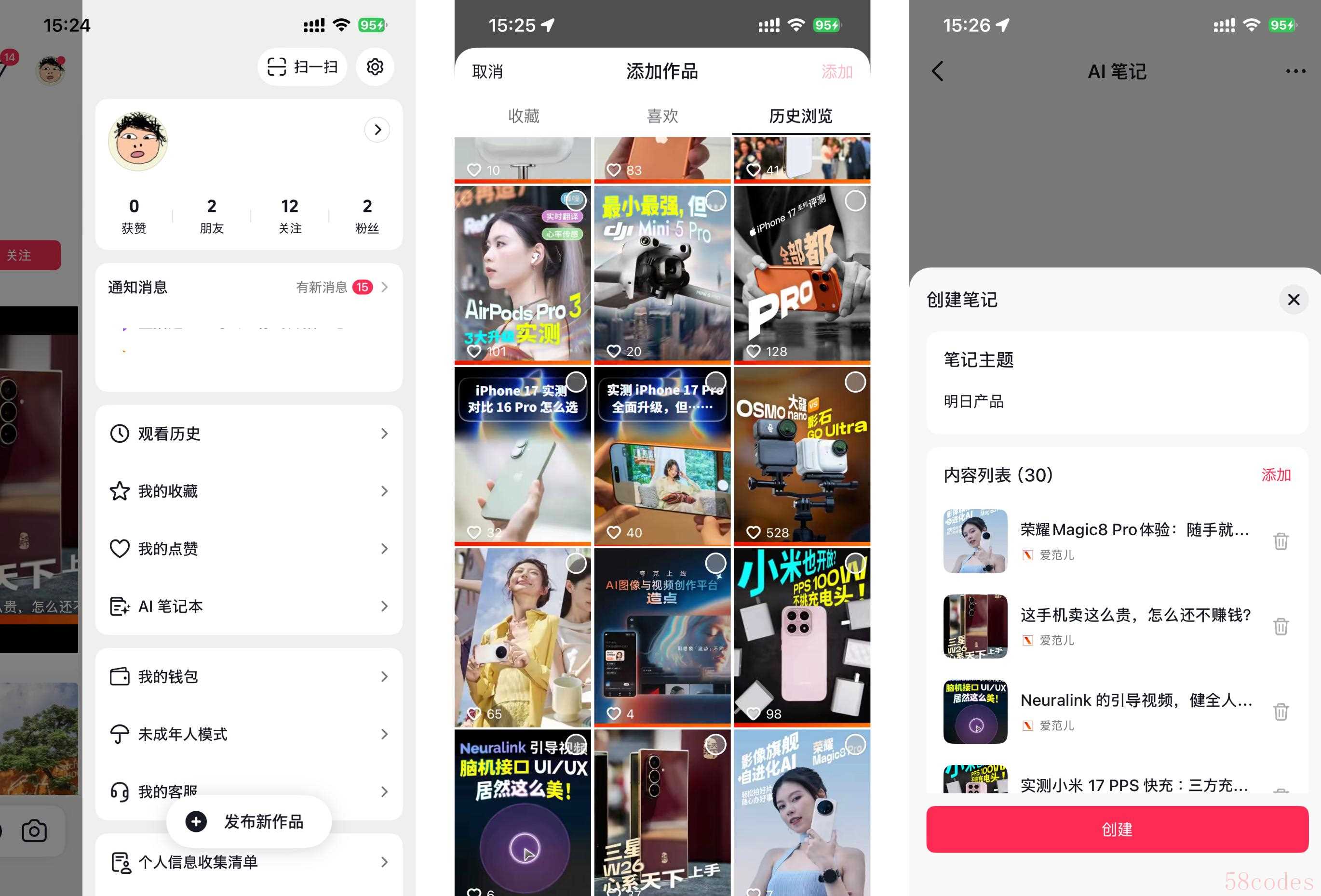 除了深度思考的问题、深度研究,AI 抖音的「会思考」还体现在它的视频分类,有「观看历史」、「我的收藏」、和「我的点赞」,还有一个「AI 笔记本」。