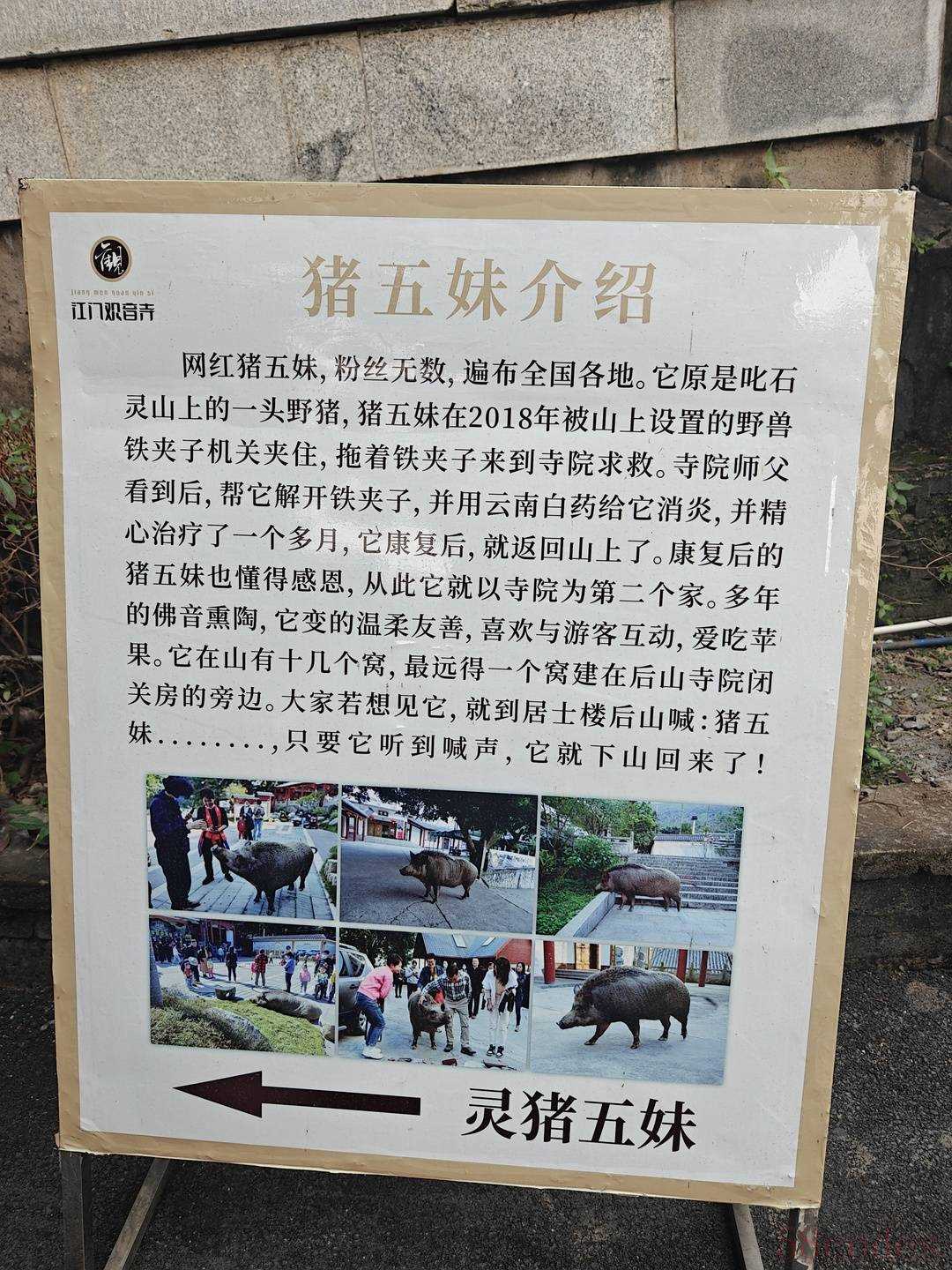 在广东省江门市,有一只名叫“猪五妹”的网红猪,因幼时被人类救助,从此与人类结下了不解的缘分。初次见面,你或许会被它彪悍的体型和粗犷的外形吓到,但观音寺的义工梁女士会笑着告诉你:“别怕,它性格好得很,最爱吃苹果,看到好吃的眼睛会眯成‘月牙’,还会跟你点头呢。在江门的人,应该没有不知道它的。”