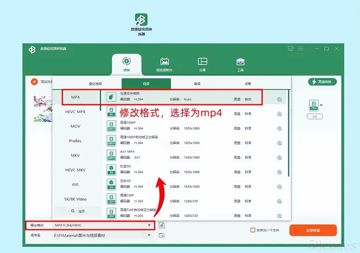2. 第二步:在【输出格式】处,选择MP4。