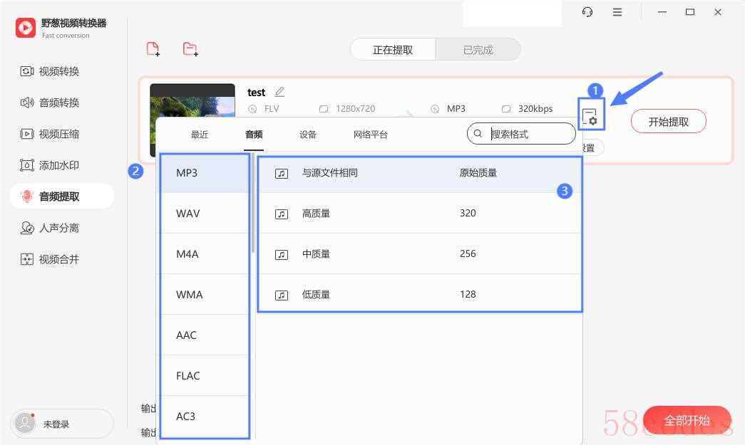 步骤3:在格式选项中选择MP3作为输出格式。根据需要调整音质和比特率等参数。点击“开始转换”按钮。等待转换完成。