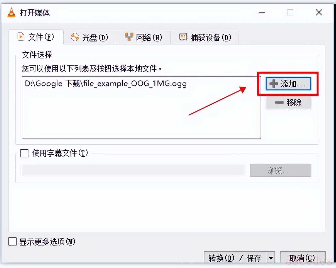 步骤2:点击左上角的菜单按钮,选择“转换/保存”。在弹出的窗口中,点击“添加”按钮,再次选择要转换的MP4文件。