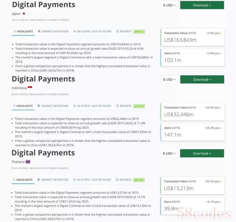 我们可以看一下市场调研机构The Statistics Portal的报告,里面有对日本、泰国以及印度尼西亚几个国家的移动支付市场规模数据。