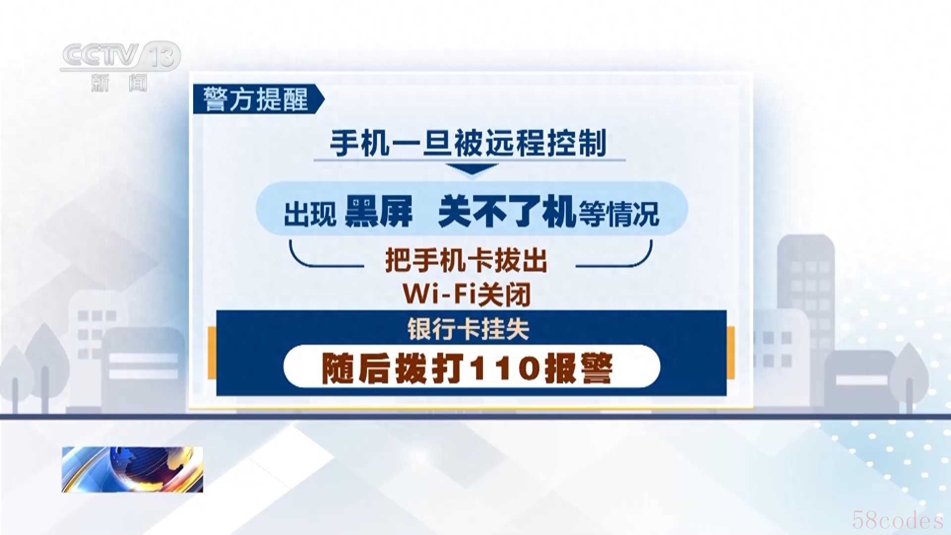 警方提醒,手机一旦被远程控制,出现黑屏、关不了机等情况,您要做的就是赶紧把手机卡拔出来,如果这个时候手机连着家里的Wi-Fi的话,一定要把Wi-Fi关闭。下一步就要立即给银行打电话,把银行卡赶紧挂失,随后拨打110报警,让警方及时对银行卡进行止付。