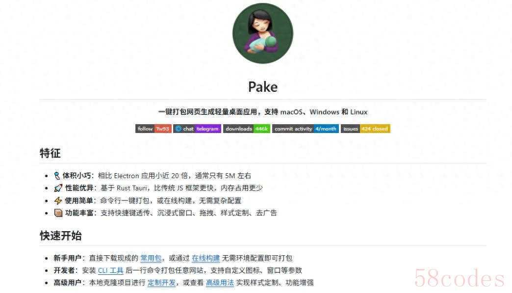Pake是一个完全开源的项目,由一位有爱的开发者tw93主导。他在文档中幽默地提到:“我有两只猫,汤圆和可乐,如果你觉得Pake让你的生活更美好,可以给它们买点吃的”