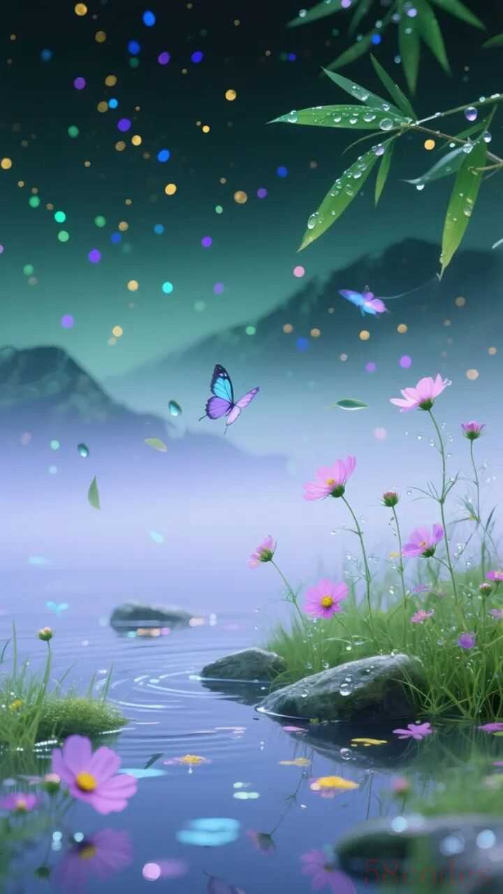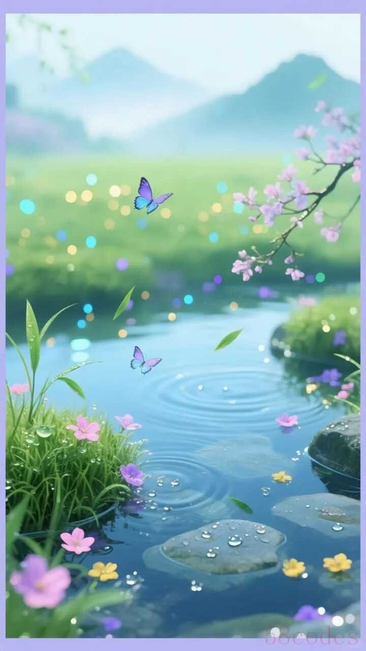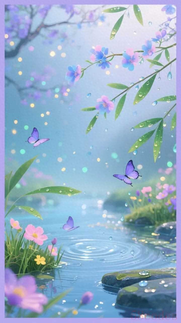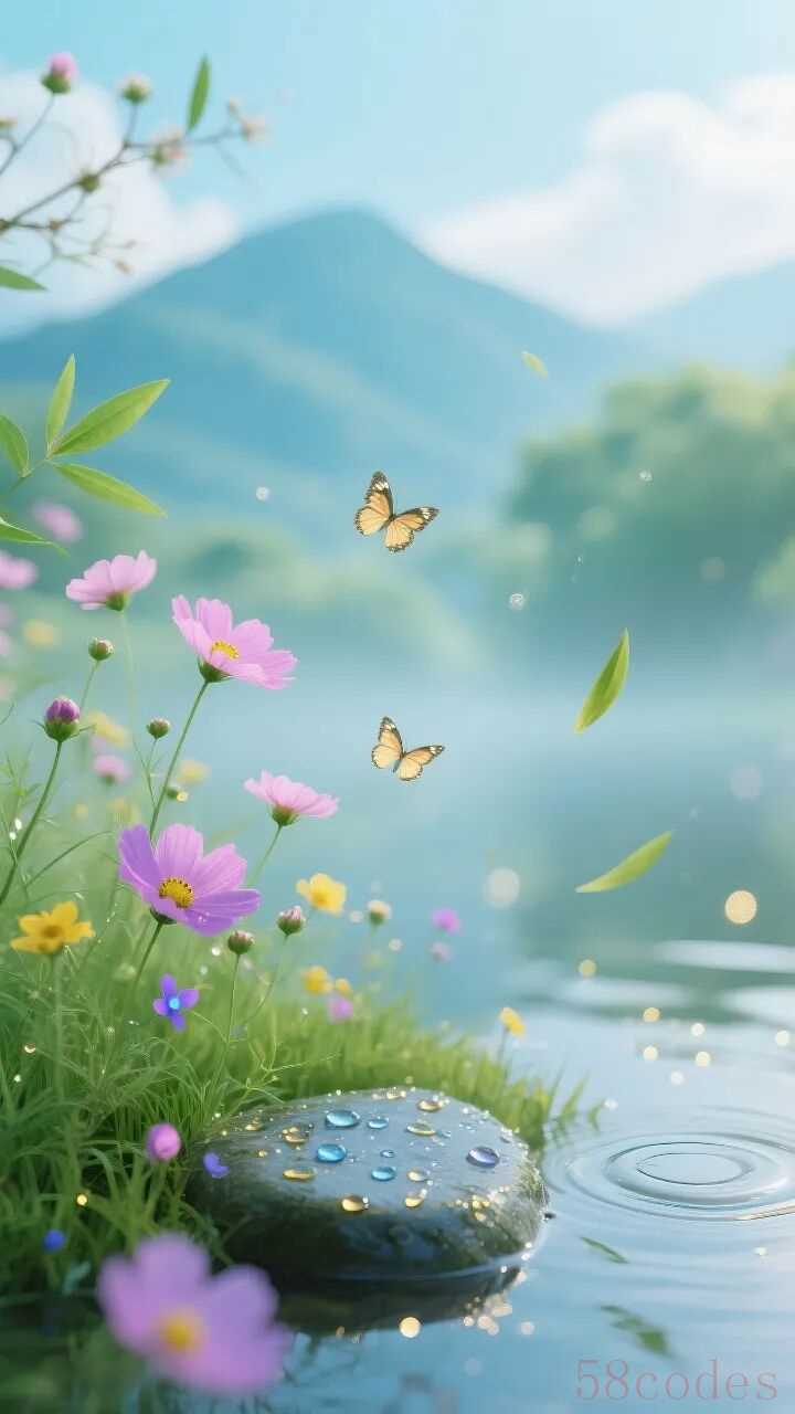 1. "极简风景:" 单一色块的天空、水面,点缀一两棵简化线条的树木或几朵简约花朵。