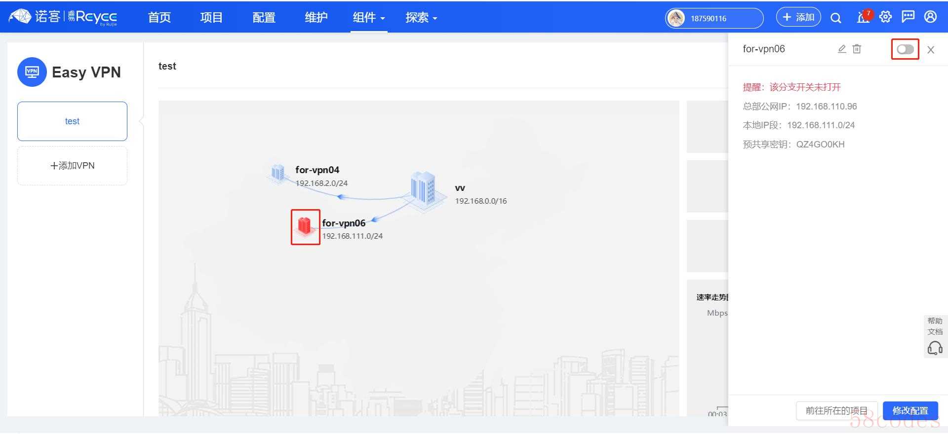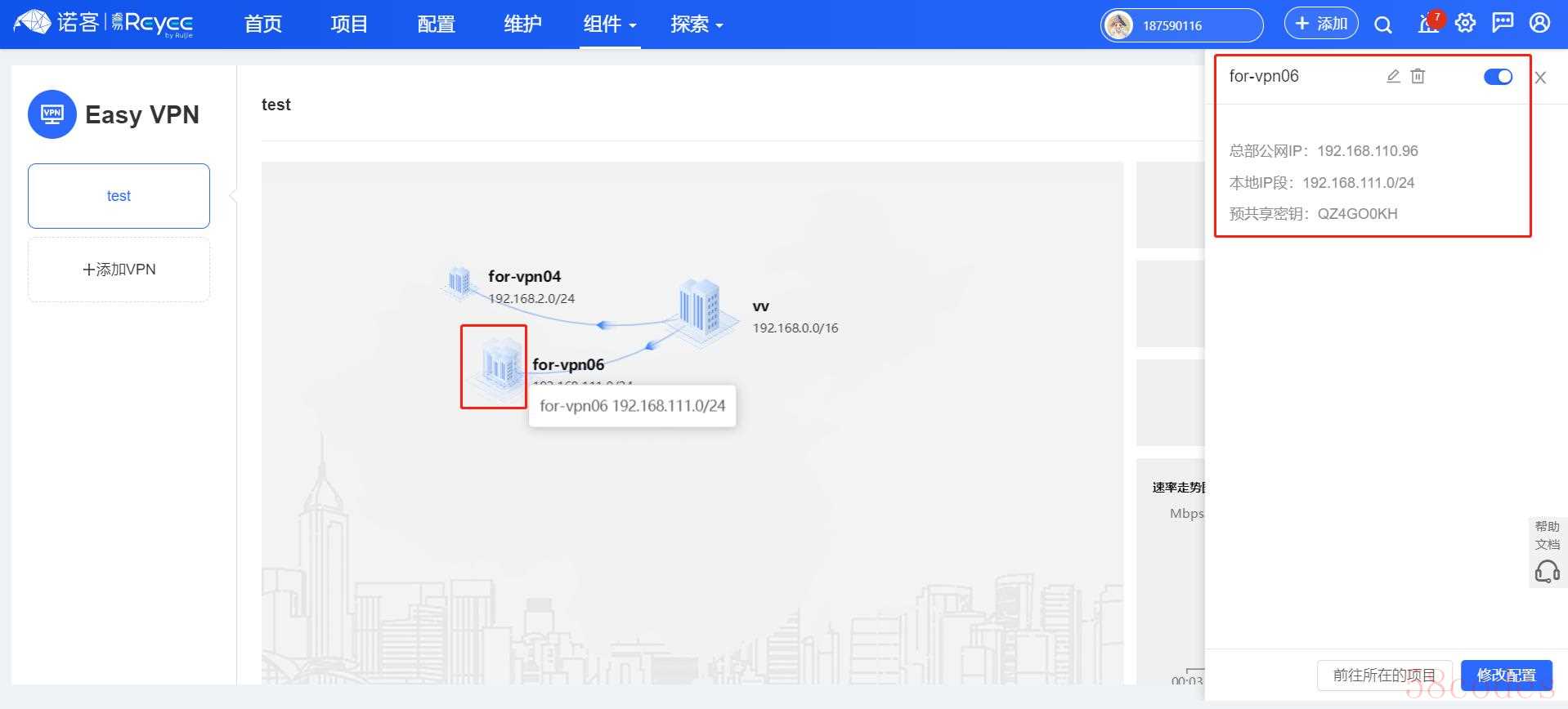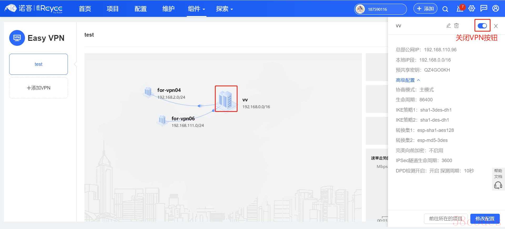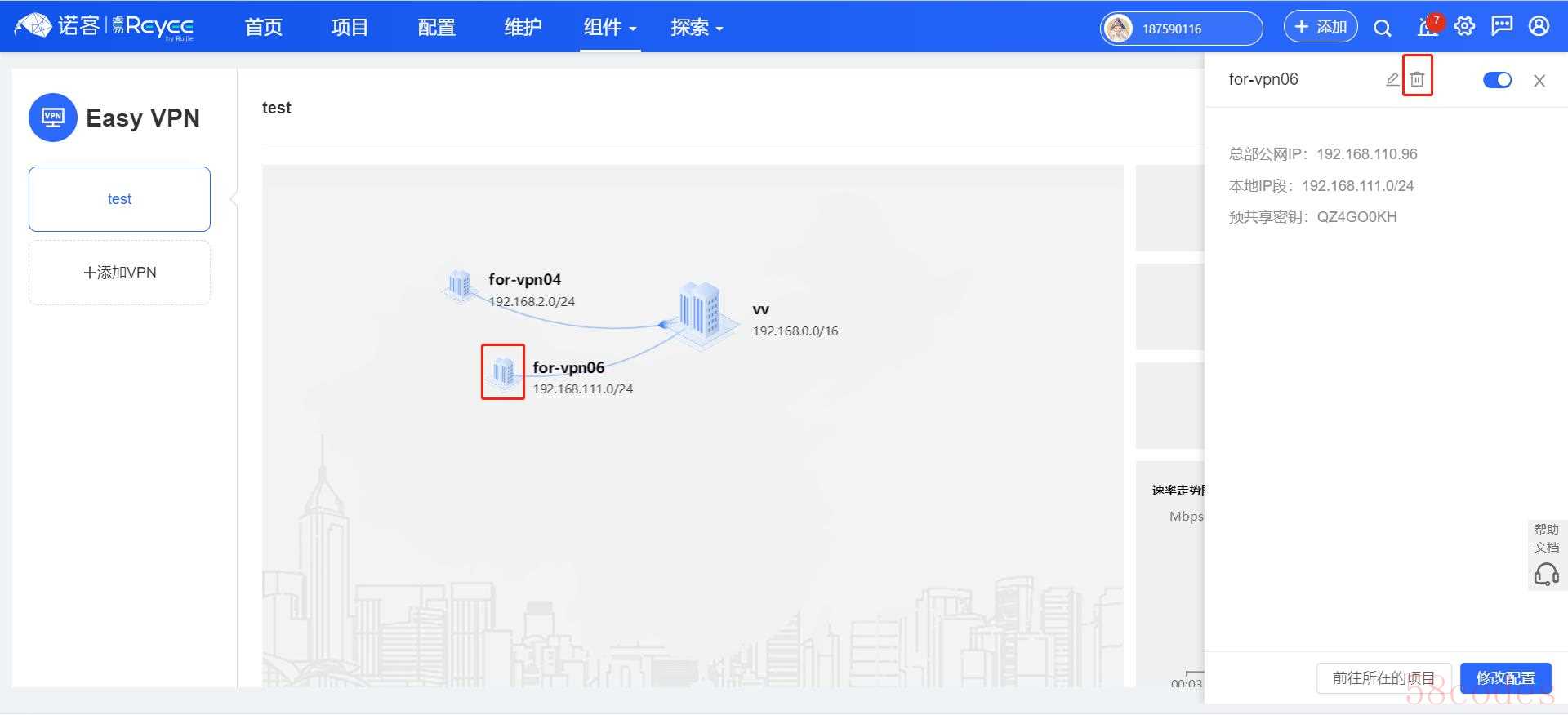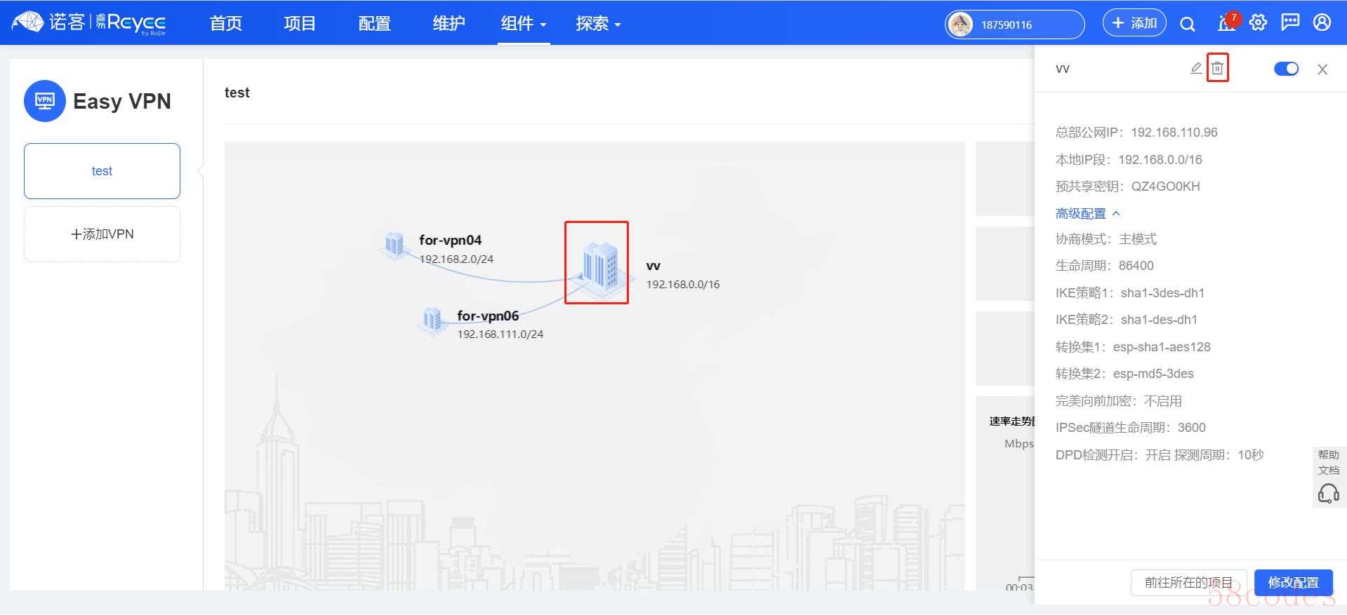 b 删除某一个分支机构的VPN,其余分支机构能够正常访问总部。点击分支机构的网络,删除VPN。 注意