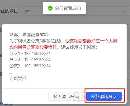 (8) 配置成功,点击<前往添加分支>,配置分支的VPN。图2-10 点击<前往添加分支>