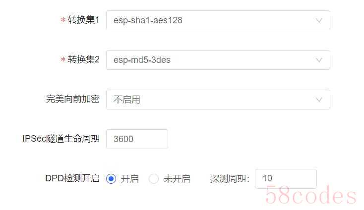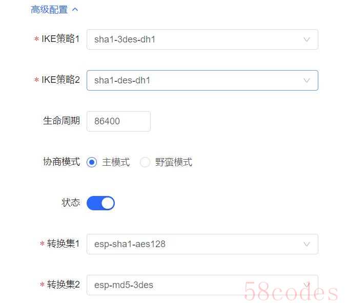 (6) 高级配置:点击高级配置可配置IKE,生命周期,协商模式等参数,建议保持默认。图2-8 高级配置参数