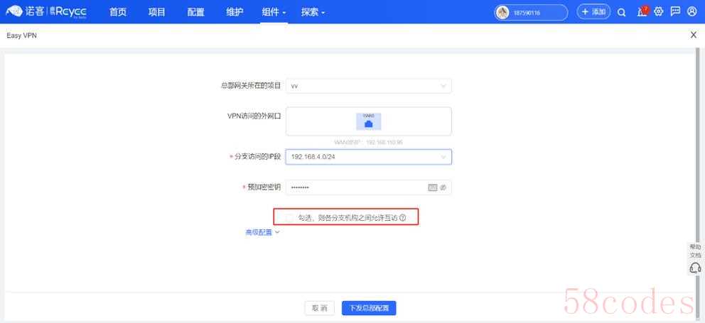 (4) VPN访问外网端口获取成功后,选择分支VPN能够访问的IP段。预加密密钥为自动生成(也可修改)。说明