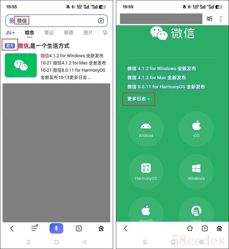 点开你手机自带的浏览器,每个人的都不一样,输入【微信】一搜,就可以找到微信官网了,这里要注意了,一定是要点前面写着【官方】这两个字的那一个。点进去后,可以看到有个【更多日志】的选项,点击该选项进入。