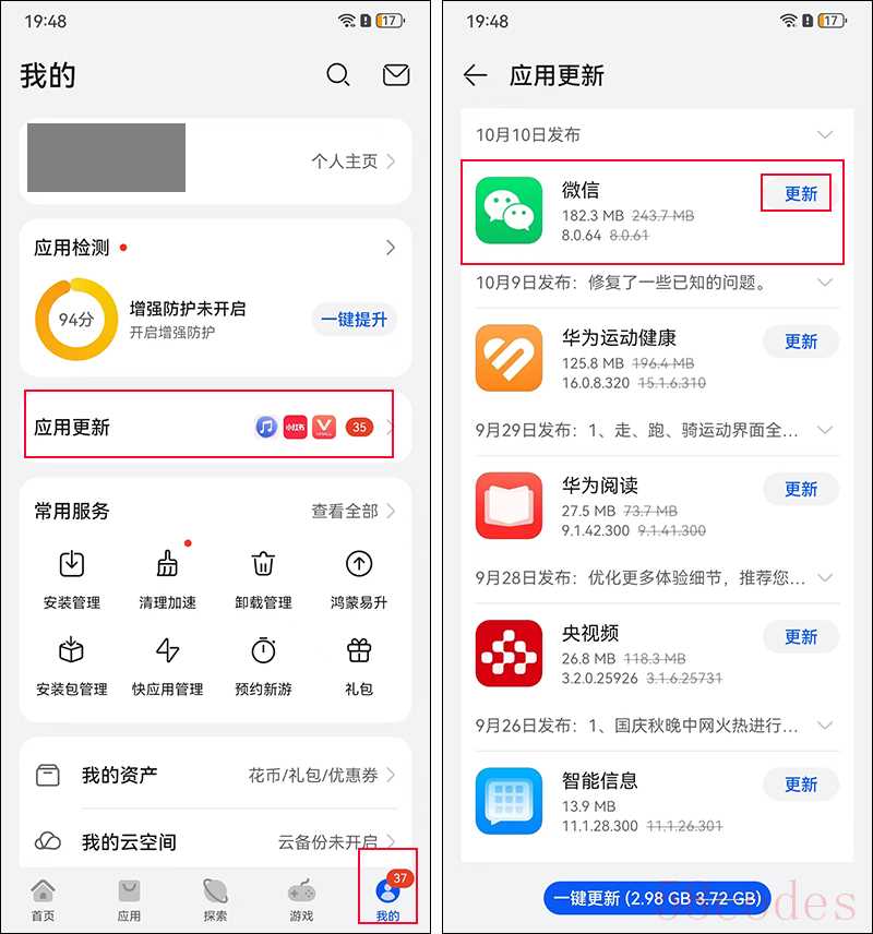 以华为手机为例,点击【应用市场】进去,点右下角的【我的】,就可以看到【应用更新】选项,点击进入,就可以看到手机里所有出了新版本的APP了,点击【查看更多】,下拉查找到微信图标,然后点微信图标右边的【更新】即可将微信升级为新版本。那如果我在应用市场的更新里也没有看到微信更新的提示,并不能通过这个方法进行版本升级呢?下面还有个终极办法。