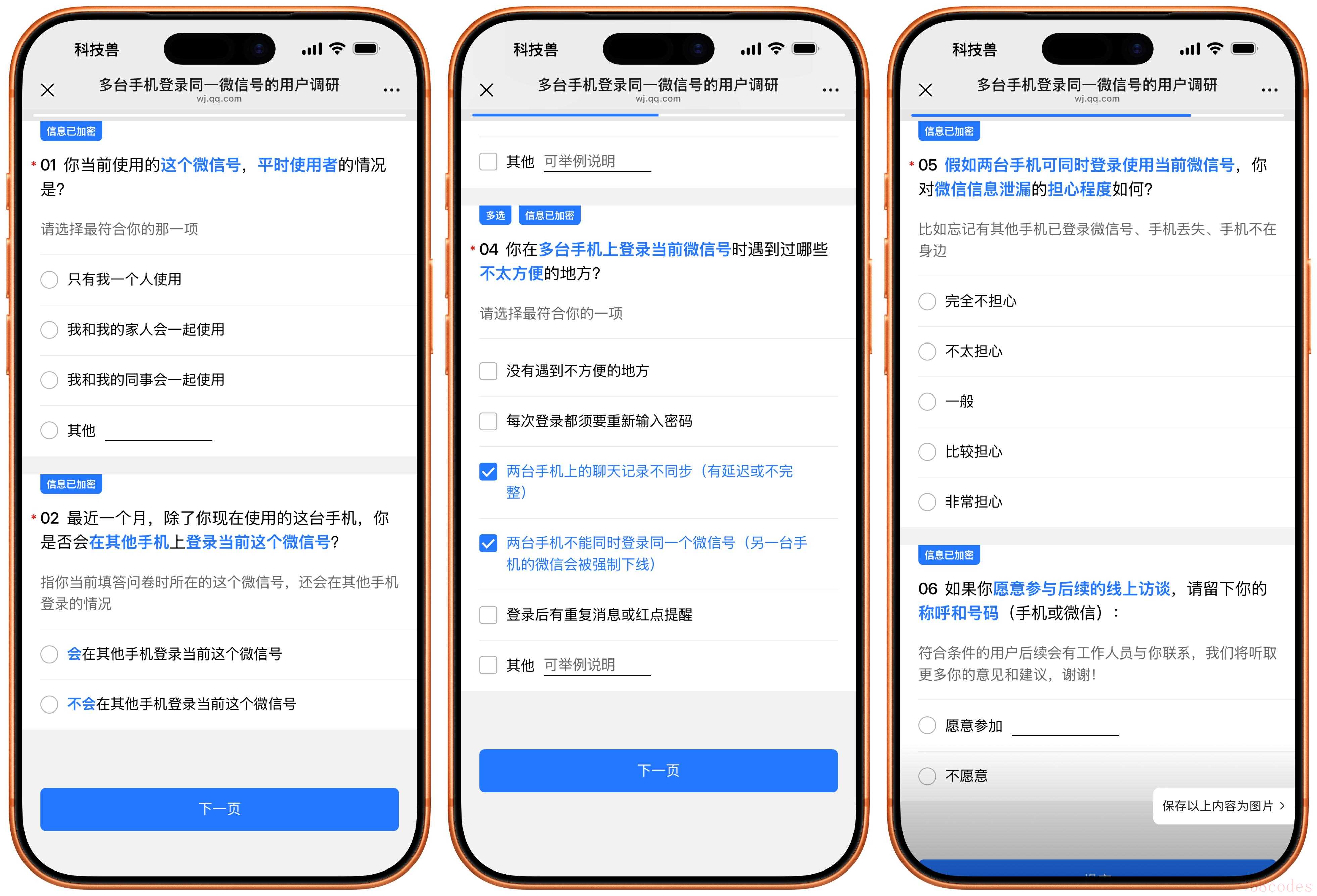 最近有网友收到来自微信团队的问卷调查,询问关于多台手机同时登录同一个微信号的需求。目前,微信虽支持在手机、平板和电脑三种设备上同时登录,但无法在两部手机上同时使用同一账号,这对双持手机或有备用机的用户来说并不方便。