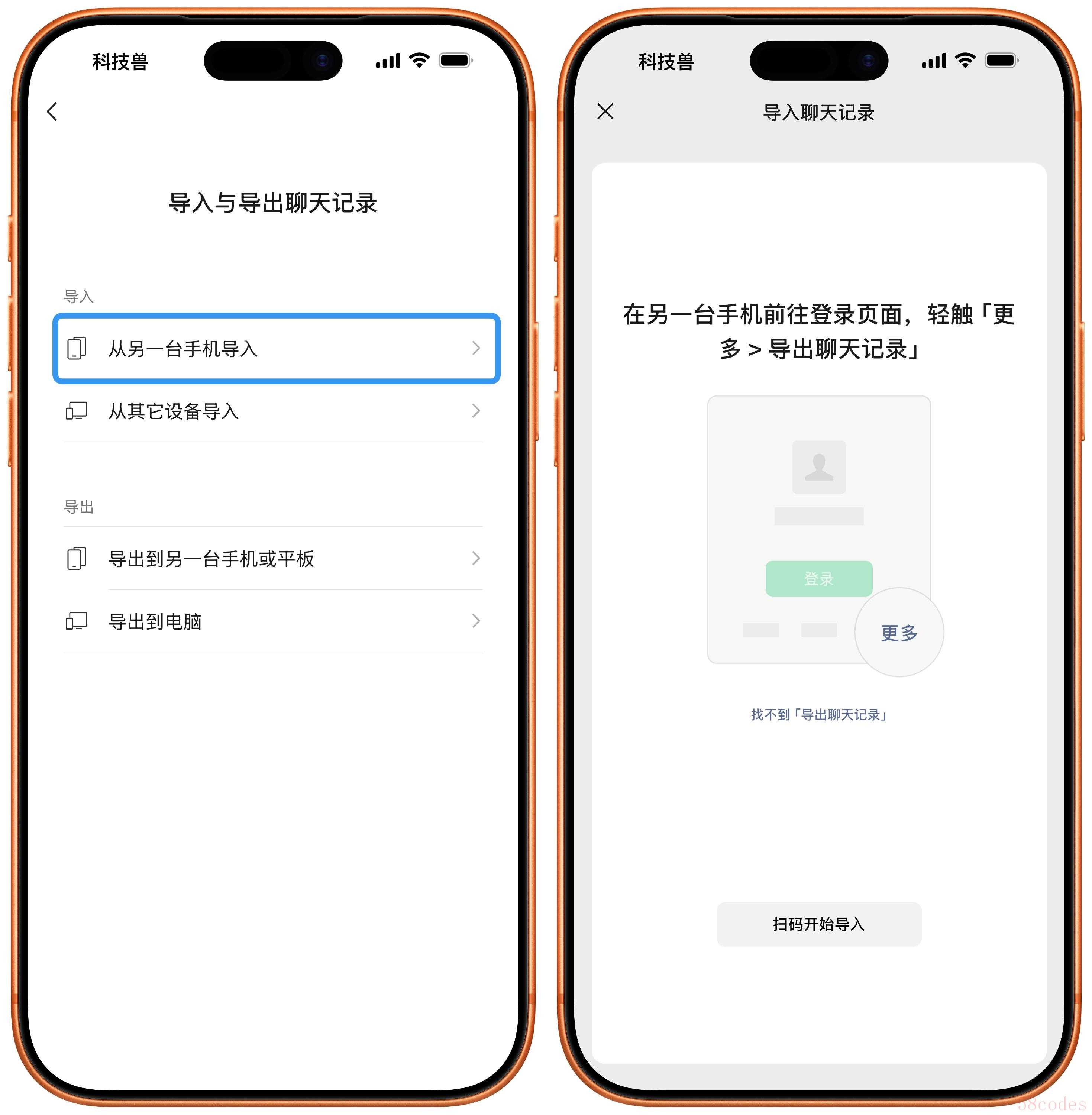 最近 iOS 微信则改进了迁移流程,在新手机登录后,只需在旧手机的登录界面点击“更多”按钮,选择“导出聊天记录”,即可直接生成二维码,随后用新机扫码即可进行迁移。